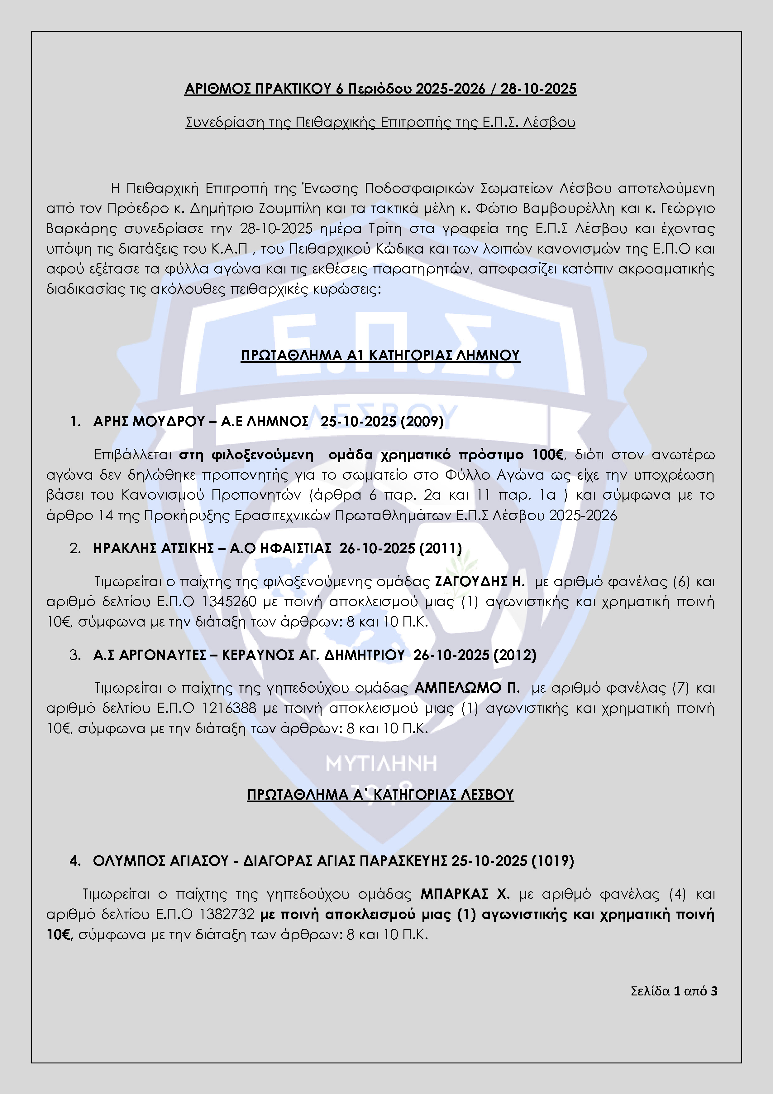 Απόφαση Πειθαρχικής Επιτροπής Ε.Π.Σ Λέσβου Αγωνιστικής Περιόδου 2025-2026 (Πρακτικό 6)
