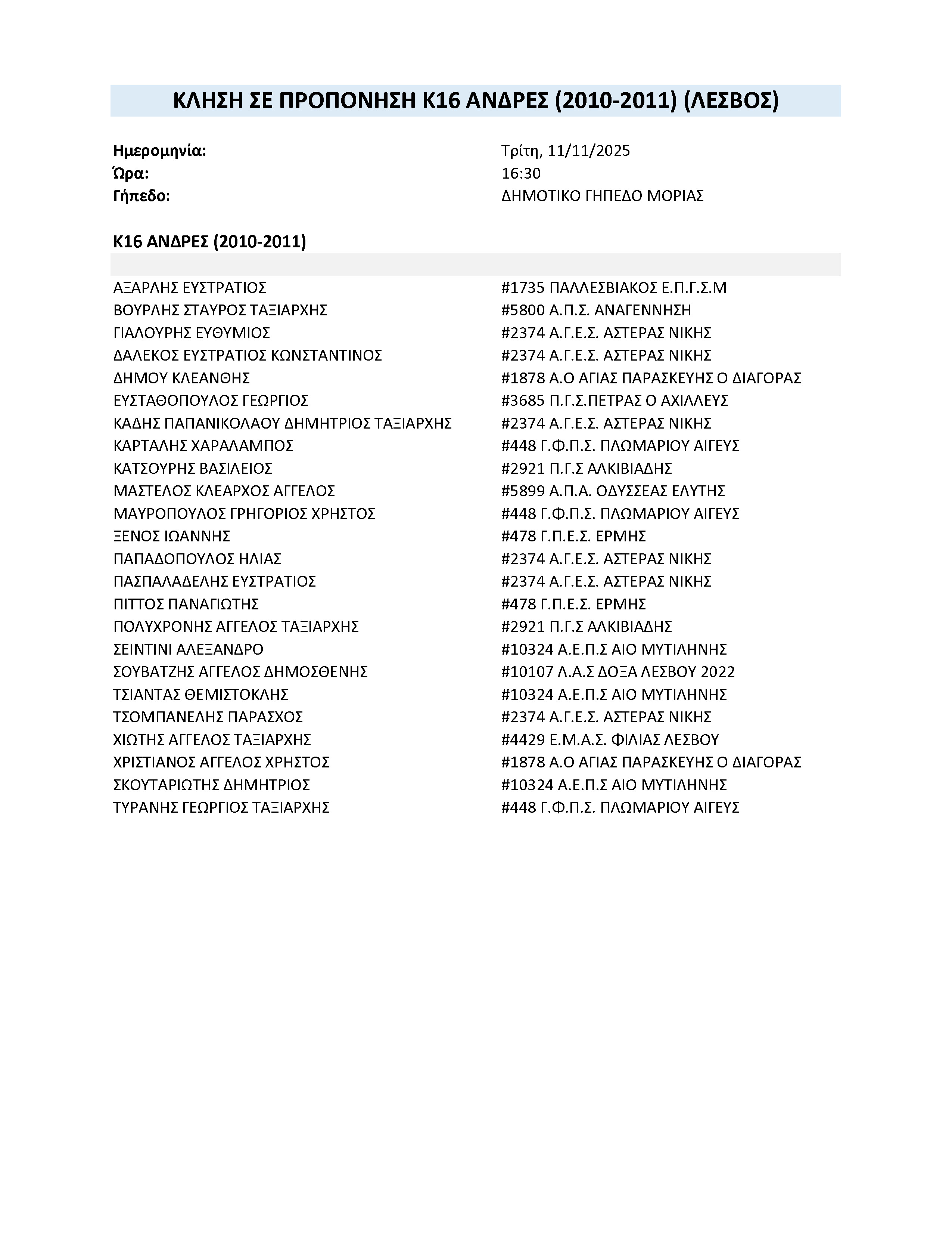 Η Ε.Π.Σ. Λέσβου καλεί τους παρακάτω ποδοσφαιριστές της ηλικιακής κατηγορίας Κ-16 (γεννηθέντες 2010–2011), σε ανοικτή προπόνηση προεπιλογής που θα πραγματοποιηθεί :
