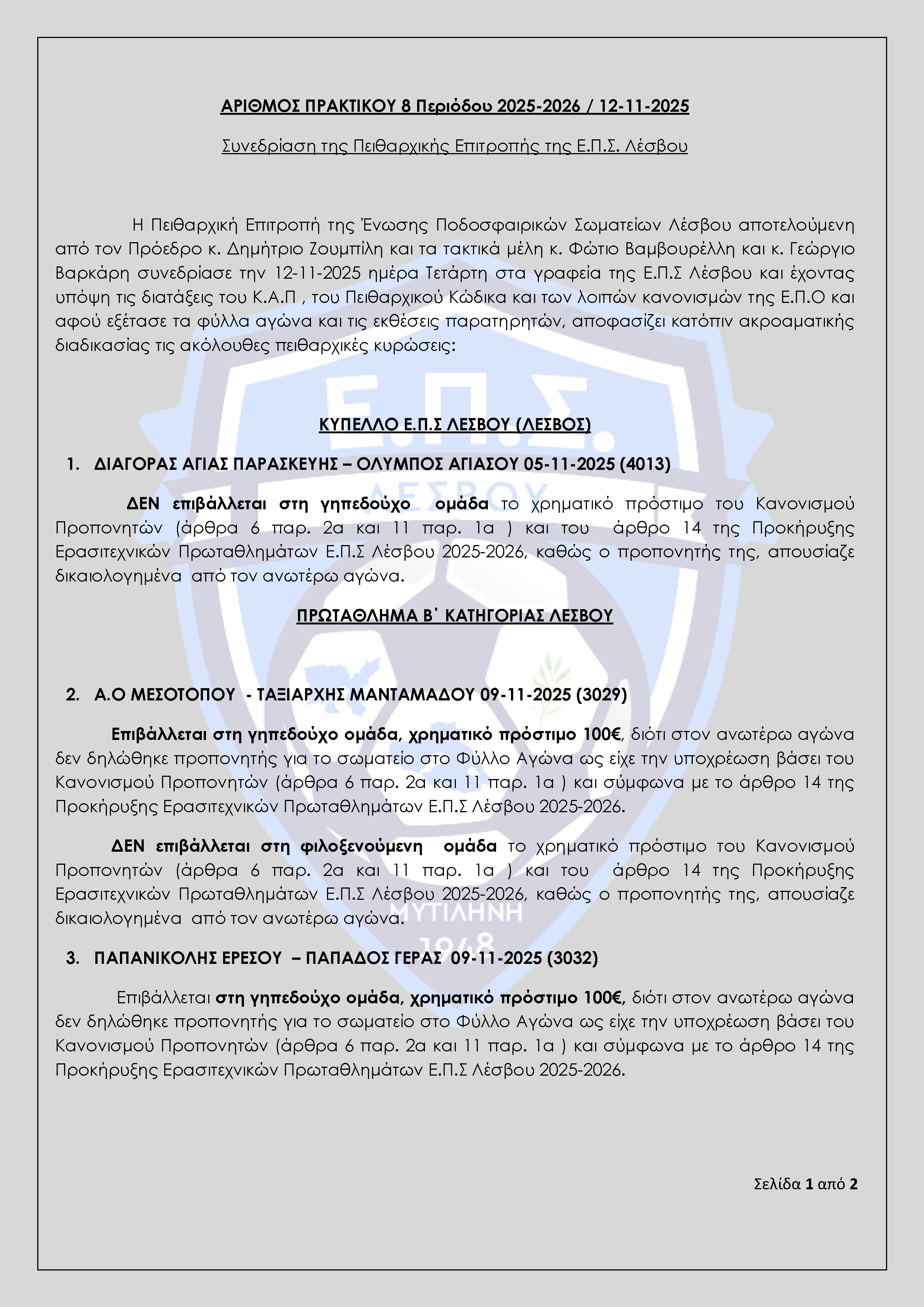 Απόφαση Πειθαρχικής Επιτροπής Ε.Π.Σ Λέσβου Αγωνιστικής Περιόδου 2025-2026 (Πρακτικό 8)