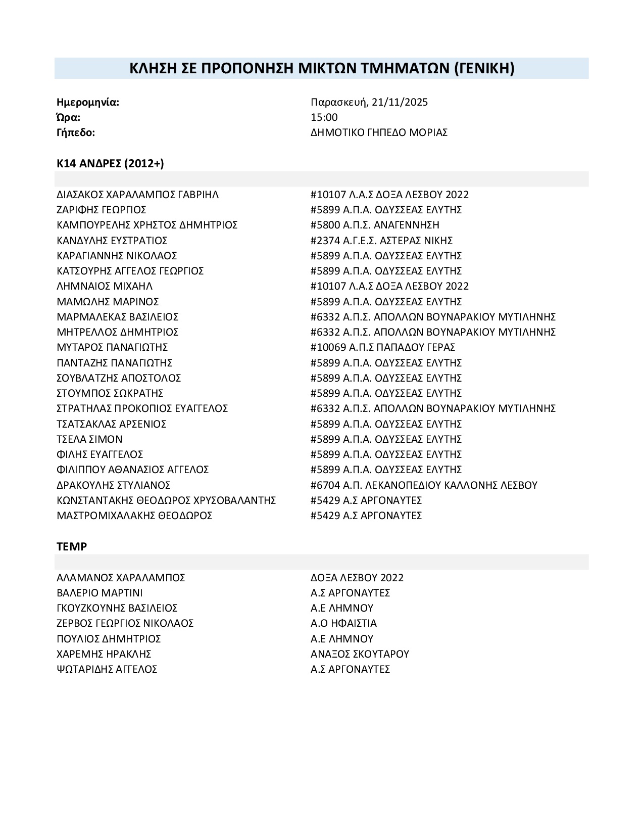 Η Ε.Π.Σ. Λέσβου καλεί τους παρακάτω ποδοσφαιριστές της ηλικιακής κατηγορίας Κ-14 (γεννηθέντες 2012–2013) σωματείων Λέσβου & Λήμνου , σε προπόνηση προεπιλογής που θα πραγματοποιηθεί :