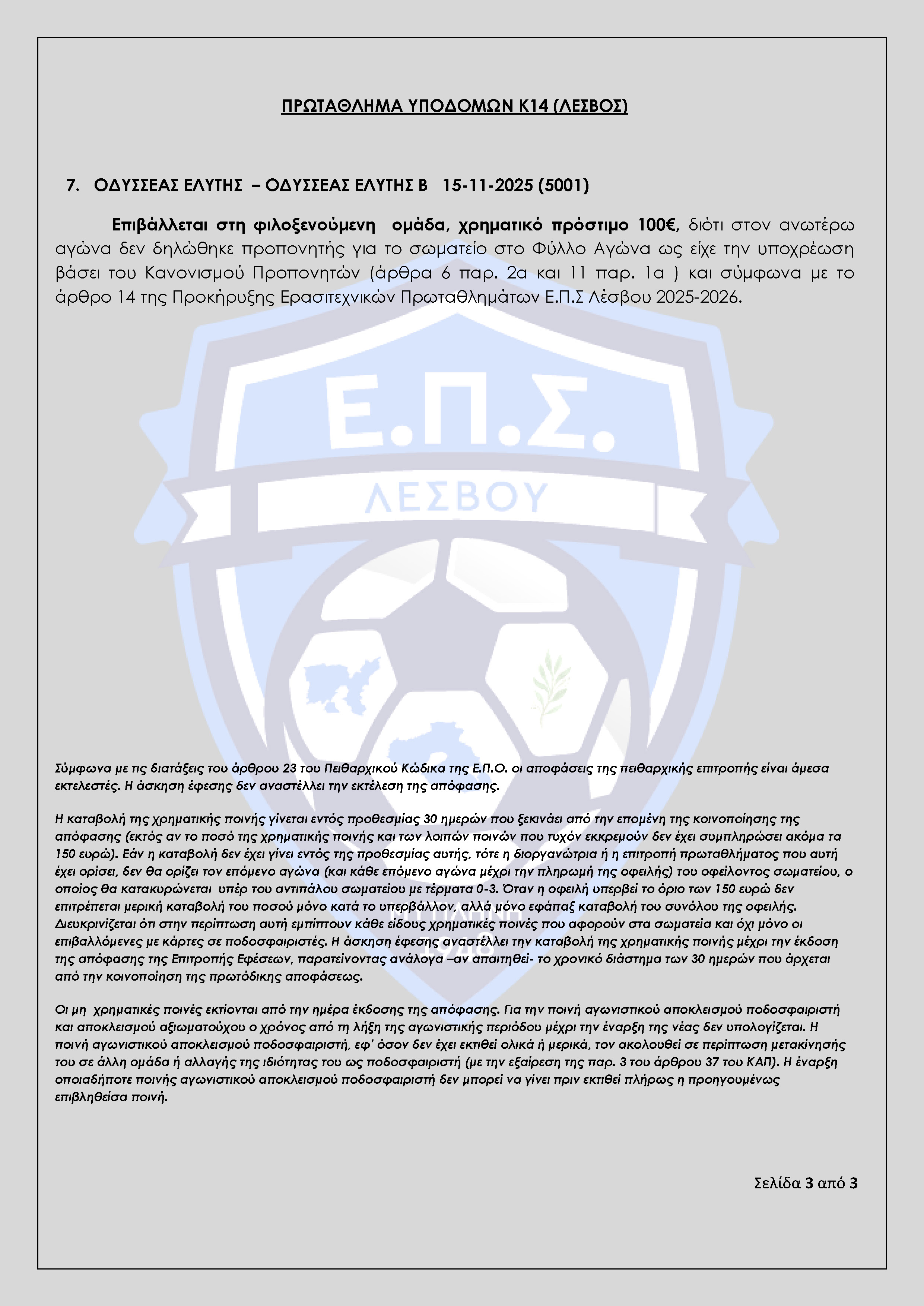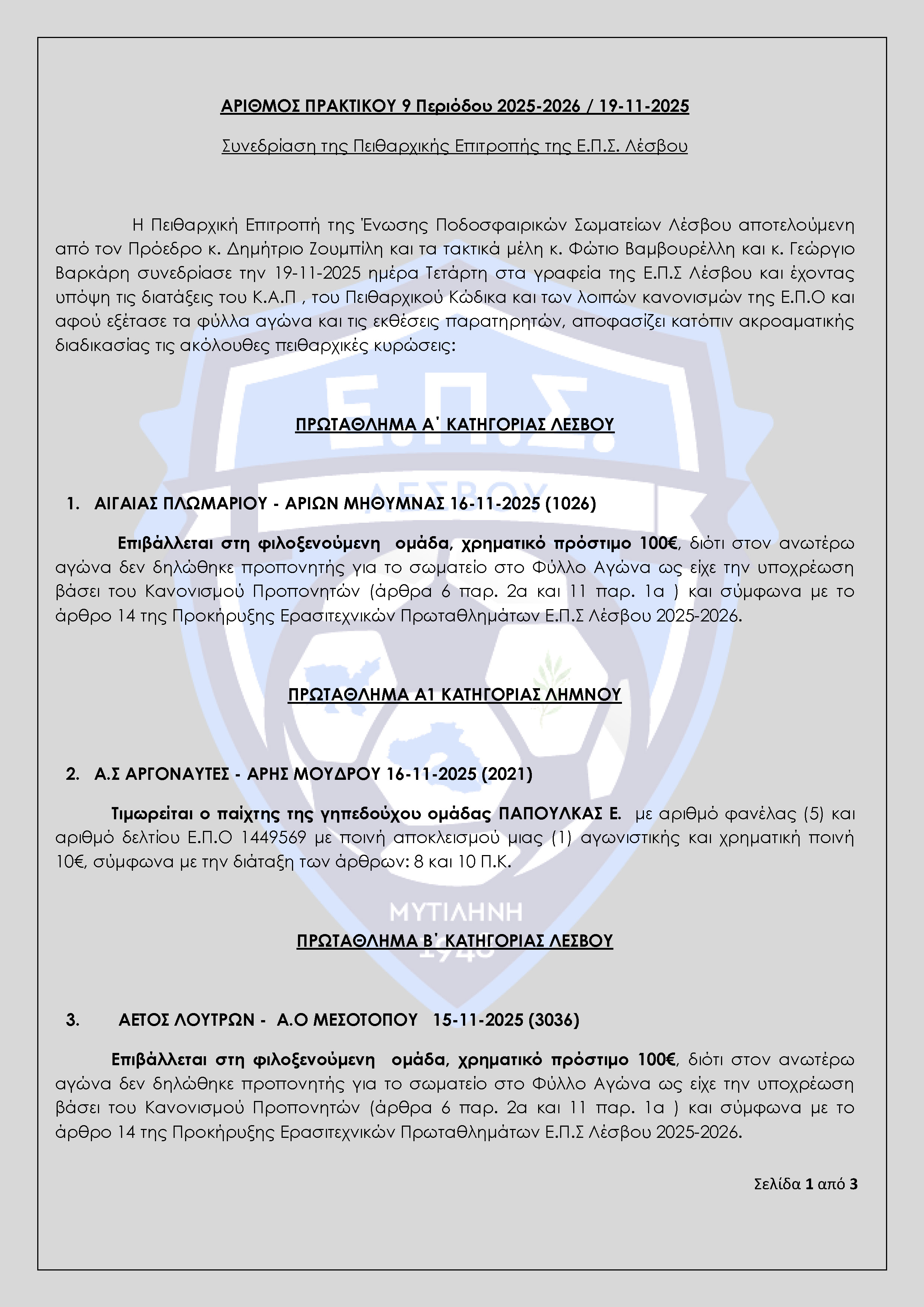 Απόφαση Πειθαρχικής Επιτροπής Ε.Π.Σ Λέσβου Αγωνιστικής Περιόδου 2025-2026 (Πρακτικό 9)