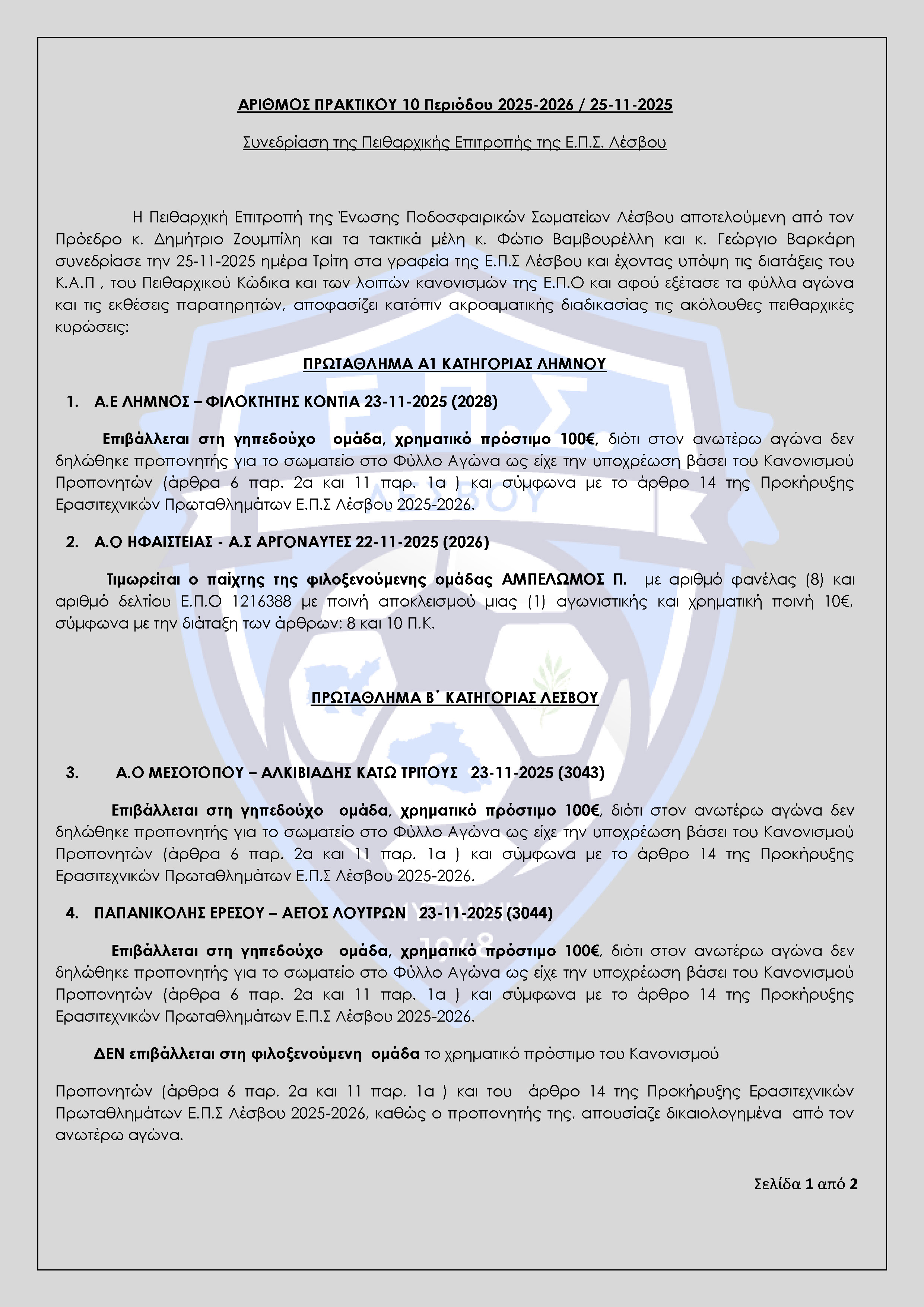 Απόφαση Πειθαρχικής Επιτροπής Ε.Π.Σ Λέσβου Αγωνιστικής Περιόδου 2025-2026 (Πρακτικό 10)