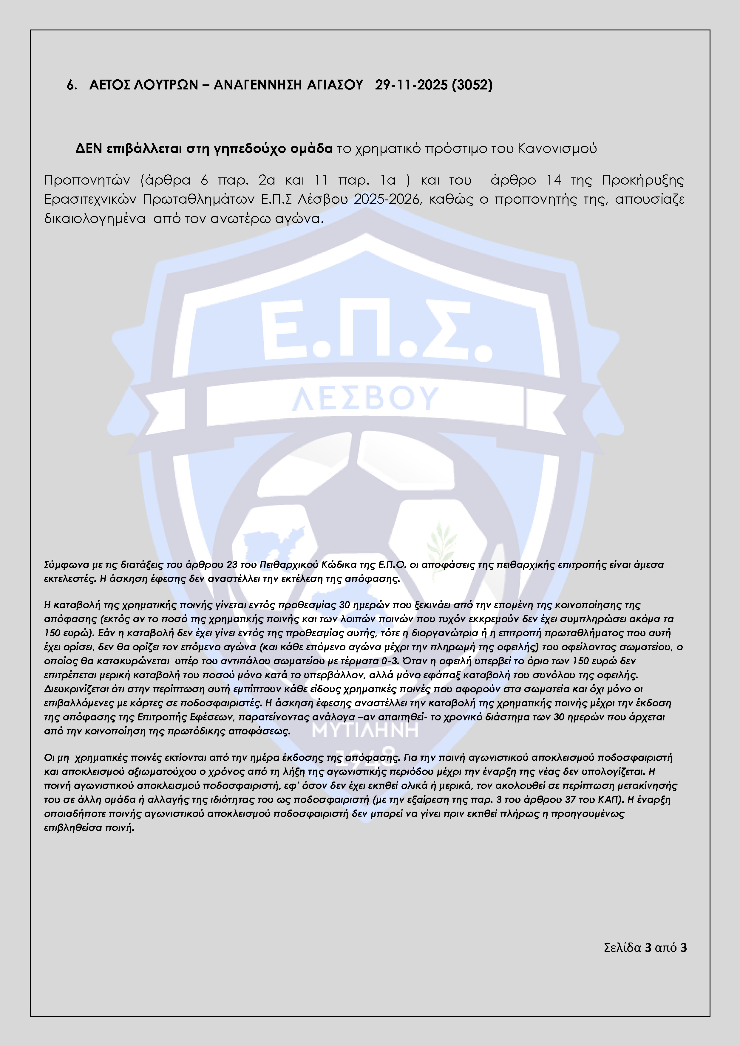 Απόφαση Πειθαρχικής Επιτροπής Ε.Π.Σ Λέσβου Αγωνιστικής Περιόδου 2025-2026 (Πρακτικό 11)