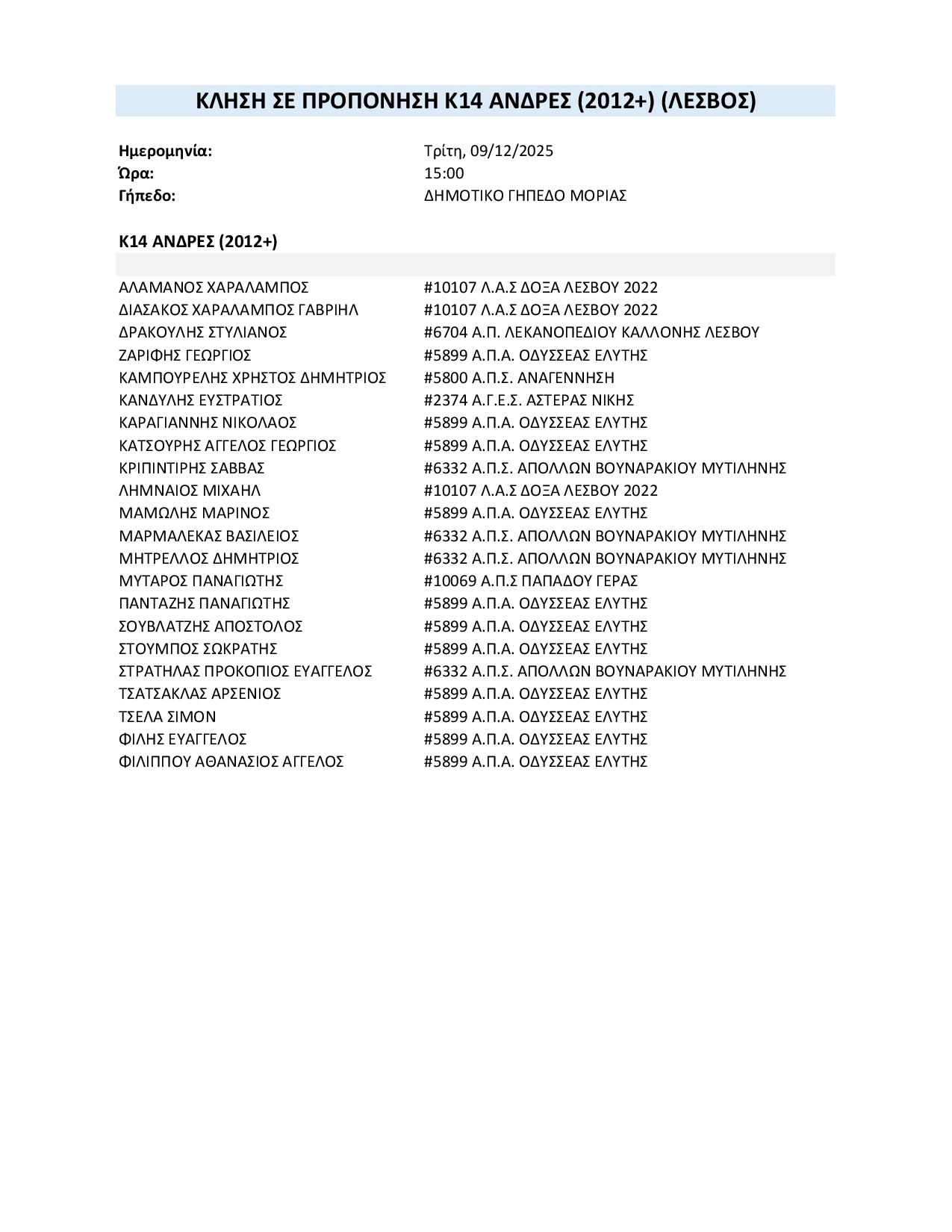 Η Ε.Π.Σ. Λέσβου καλεί τους παρακάτω ποδοσφαιριστές της ηλικιακής κατηγορίας Κ-14 (γεννηθέντες 2012–2013) σωματείων Λέσβου, σε προπόνηση που θα πραγματοποιηθεί :