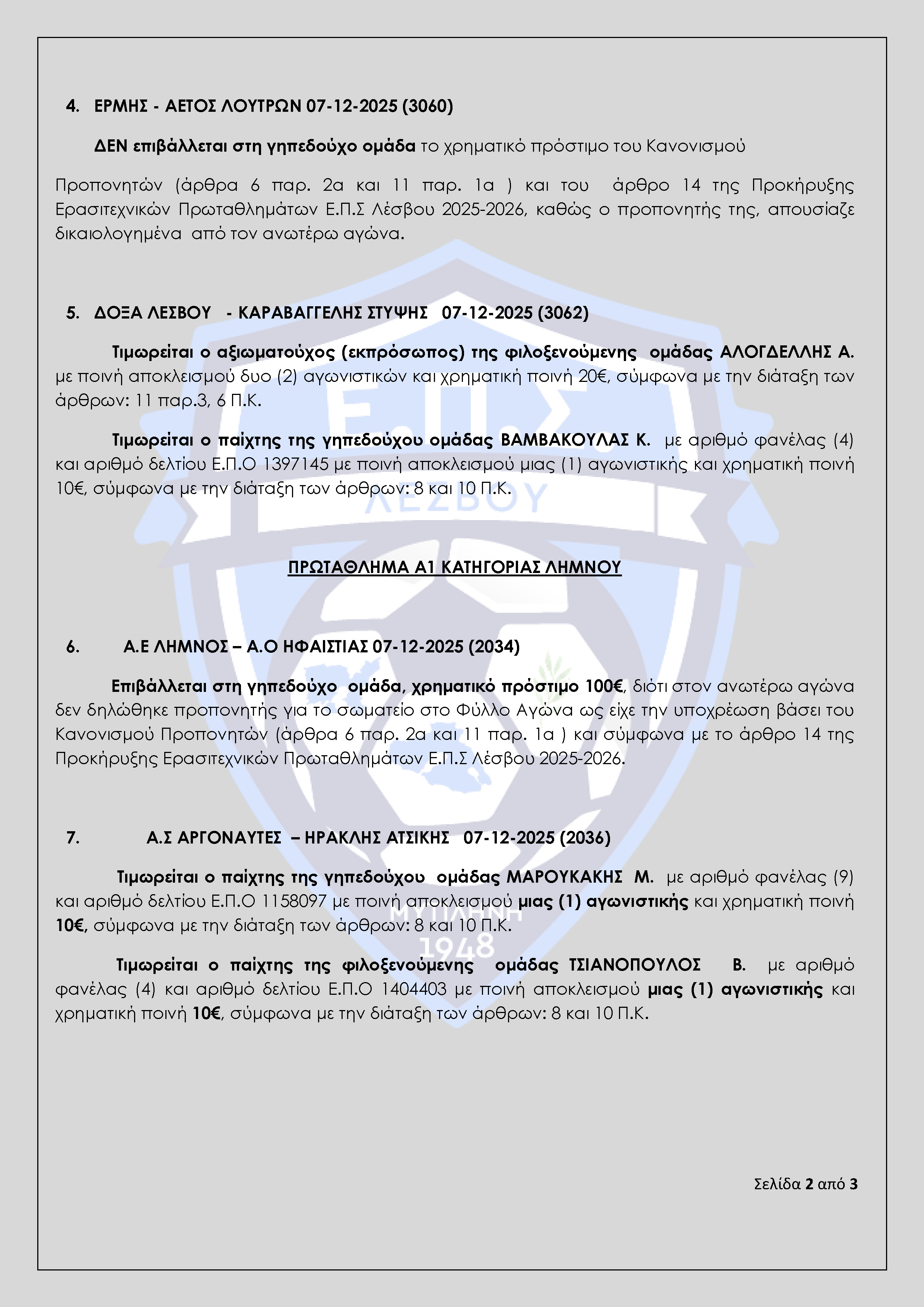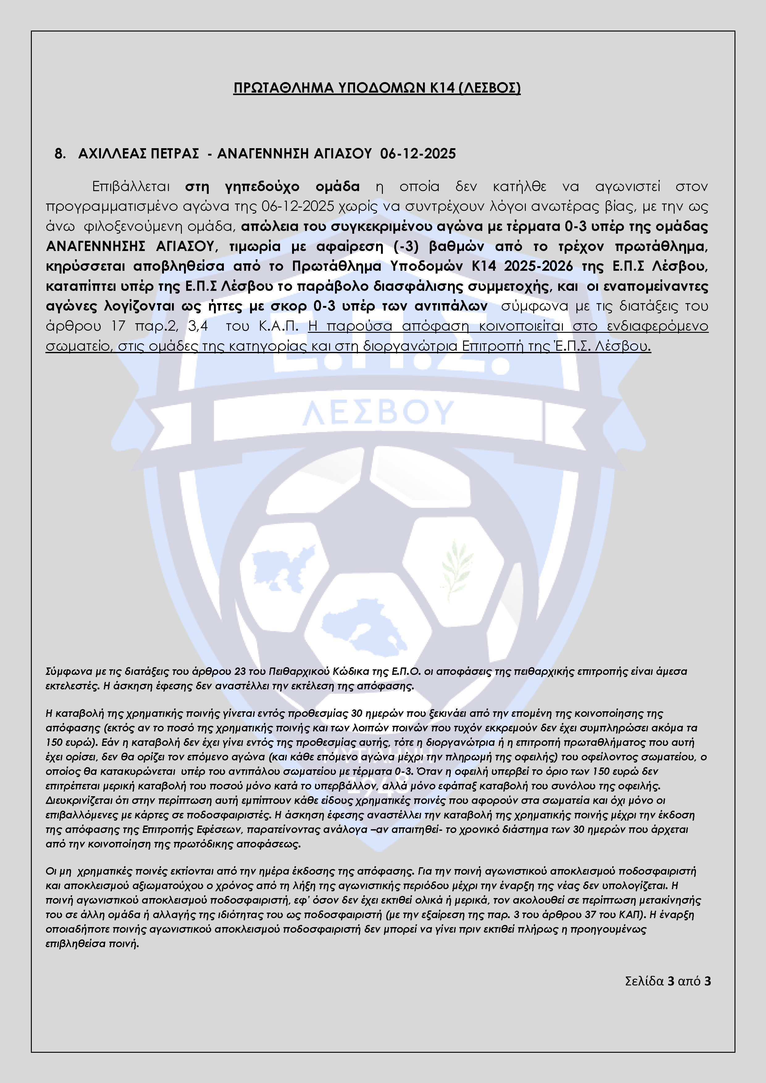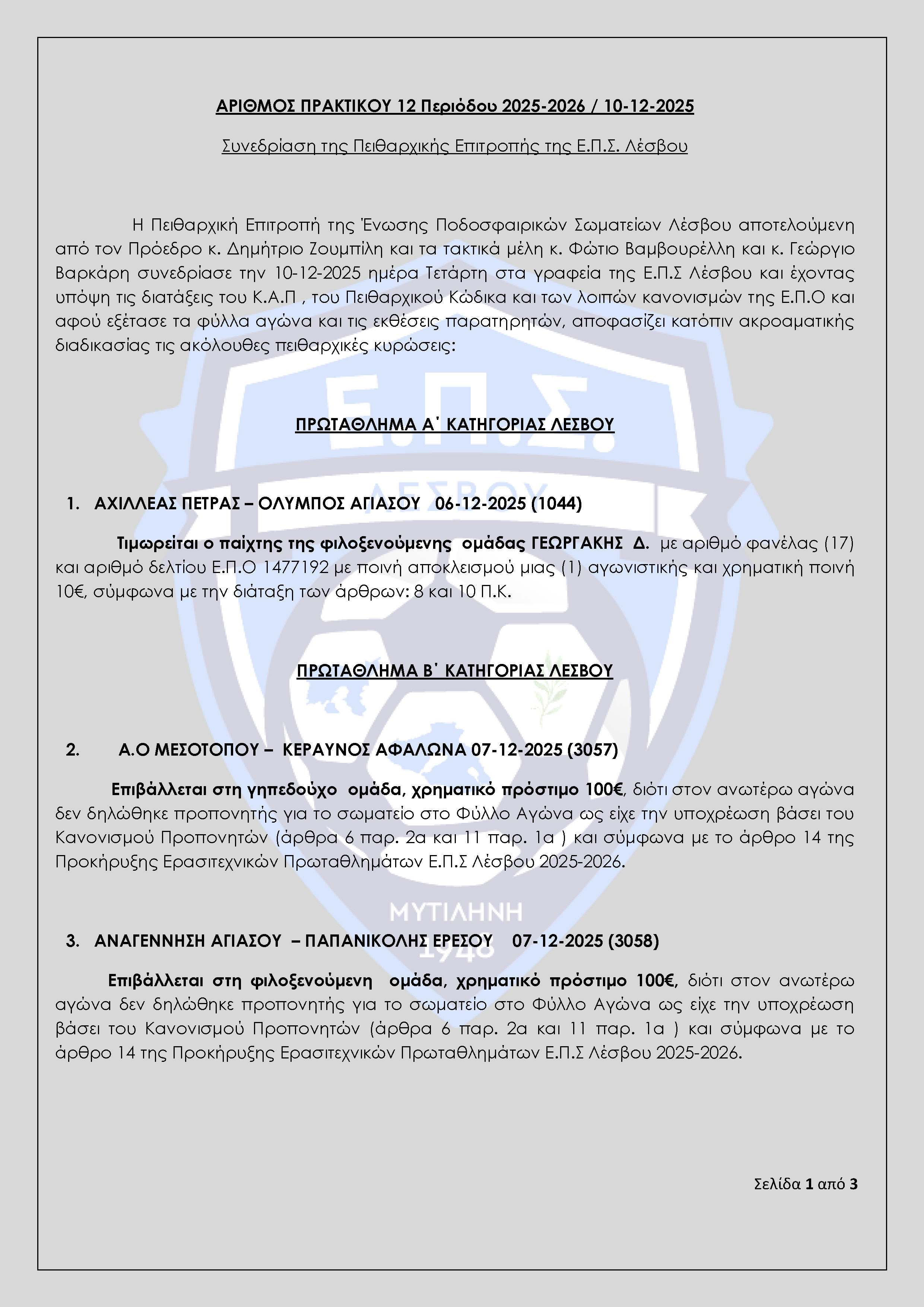 Απόφαση Πειθαρχικής Επιτροπής Ε.Π.Σ Λέσβου Αγωνιστικής Περιόδου 2025-2026 (Πρακτικό 12)