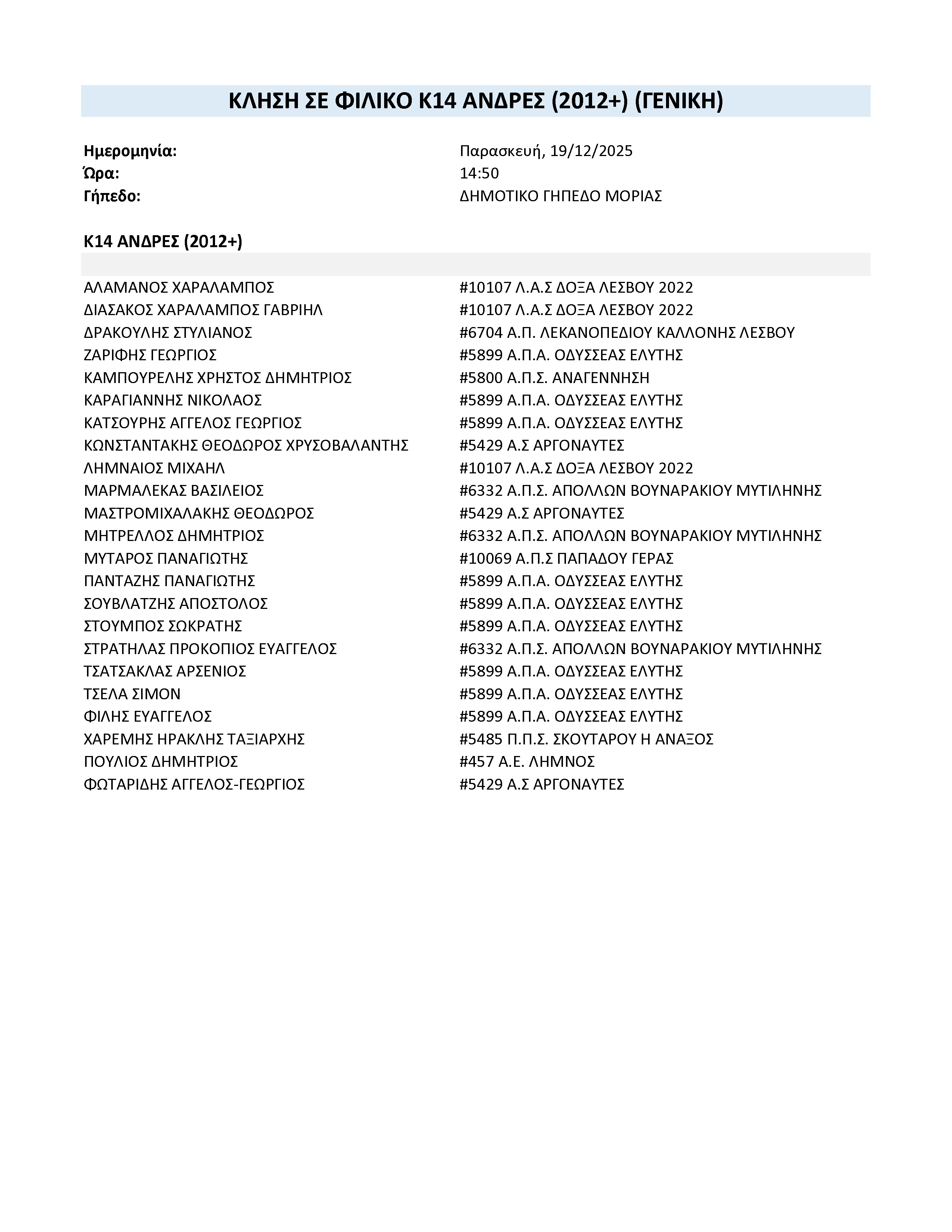 Η Ε.Π.Σ. Λέσβου καλεί τους παρακάτω ποδοσφαιριστές της ηλικιακής κατηγορίας Κ-14 (γεννηθέντες 2012–2013) σωματείων Λέσβου & Λήμνου , σε προπόνηση προεπιλογής που θα πραγματοποιηθεί :