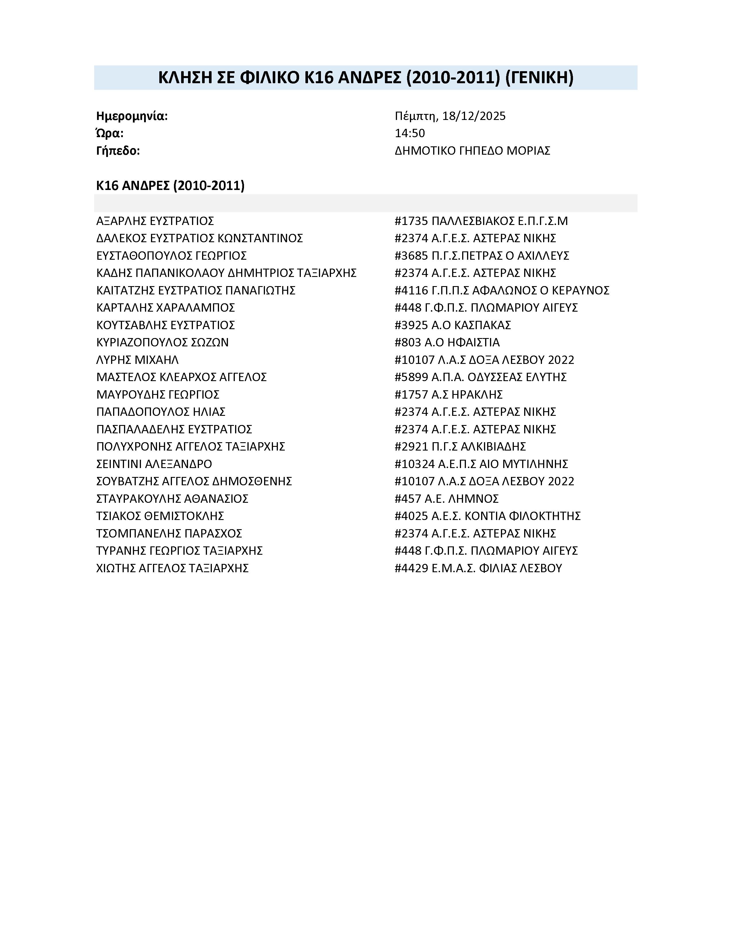 Η Ε.Π.Σ. Λέσβου καλεί τους παρακάτω ποδοσφαιριστές της ηλικιακής κατηγορίας Κ-16 (γεννηθέντες 2010–2011) σωματείων Λέσβου & Λήμνου, σε φιλικό αγώνα - προπόνηση προεπιλογής που θα πραγματοποιηθεί :
