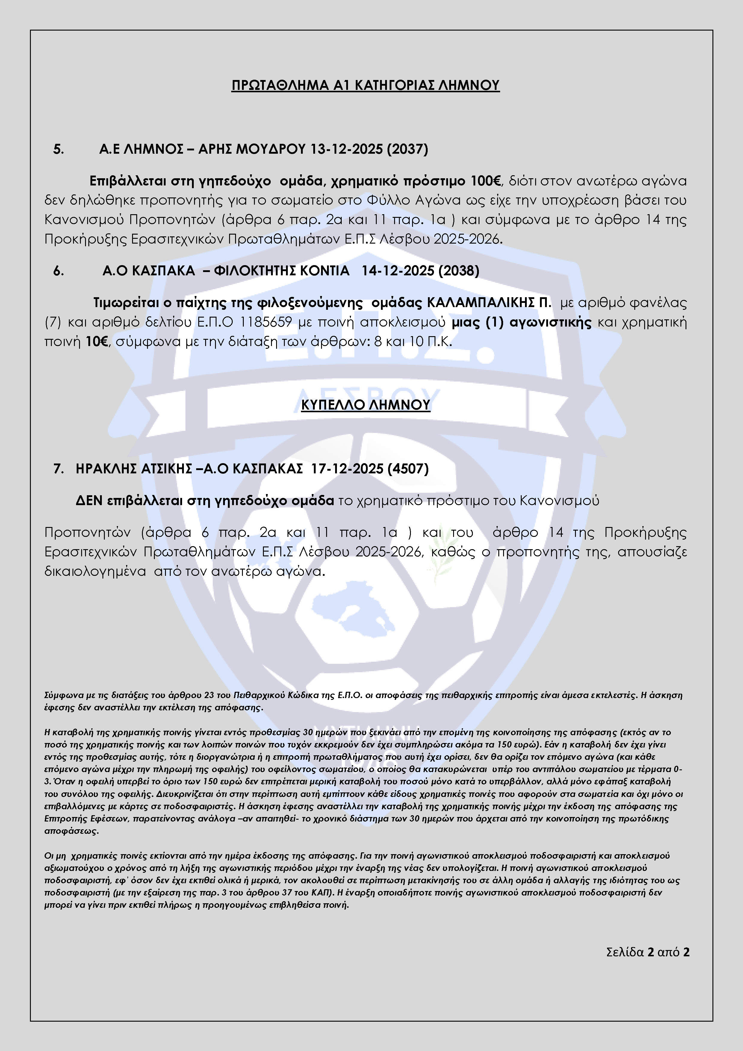 Απόφαση Πειθαρχικής Επιτροπής Ε.Π.Σ Λέσβου Αγωνιστικής Περιόδου 2025-2026 (Πρακτικό 13)