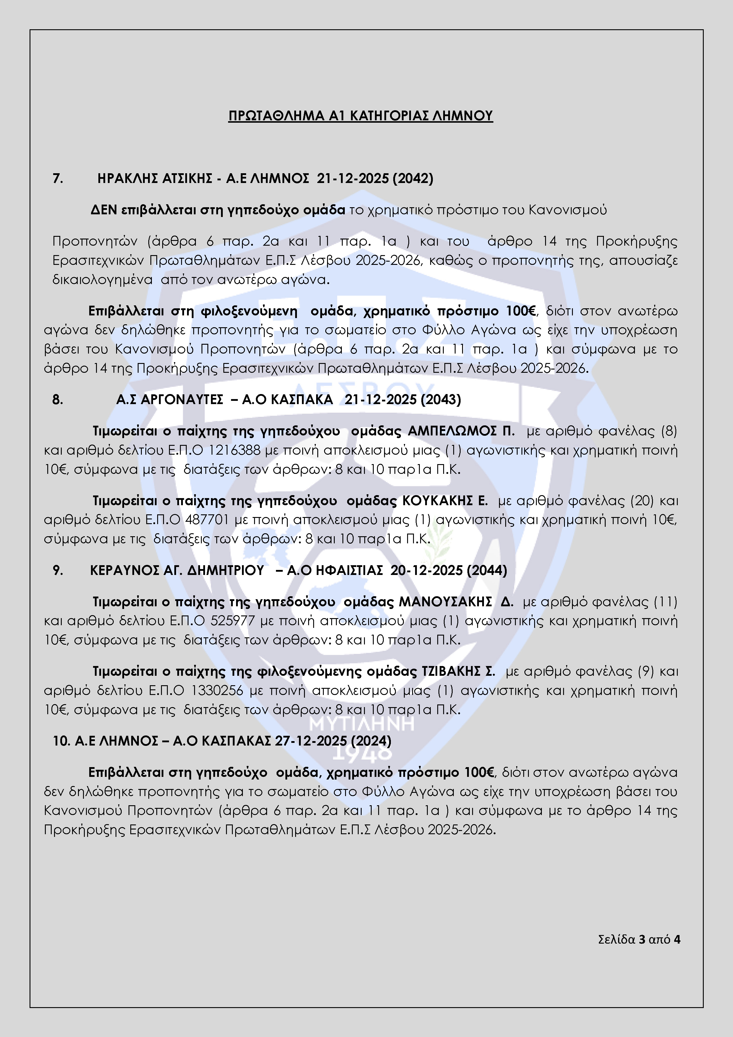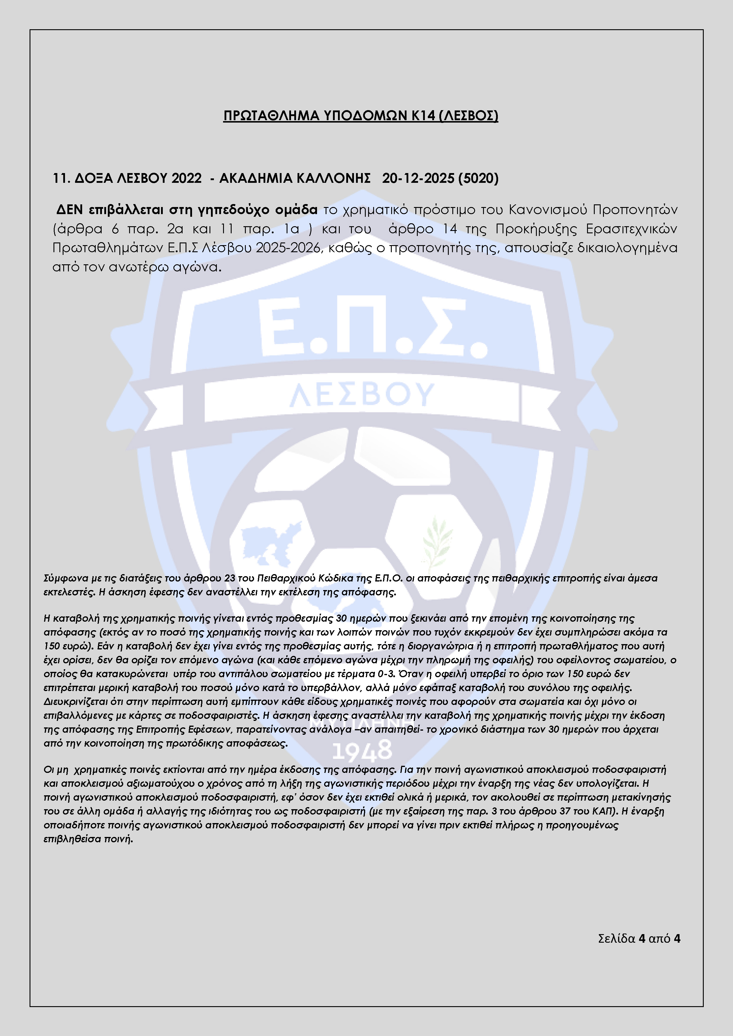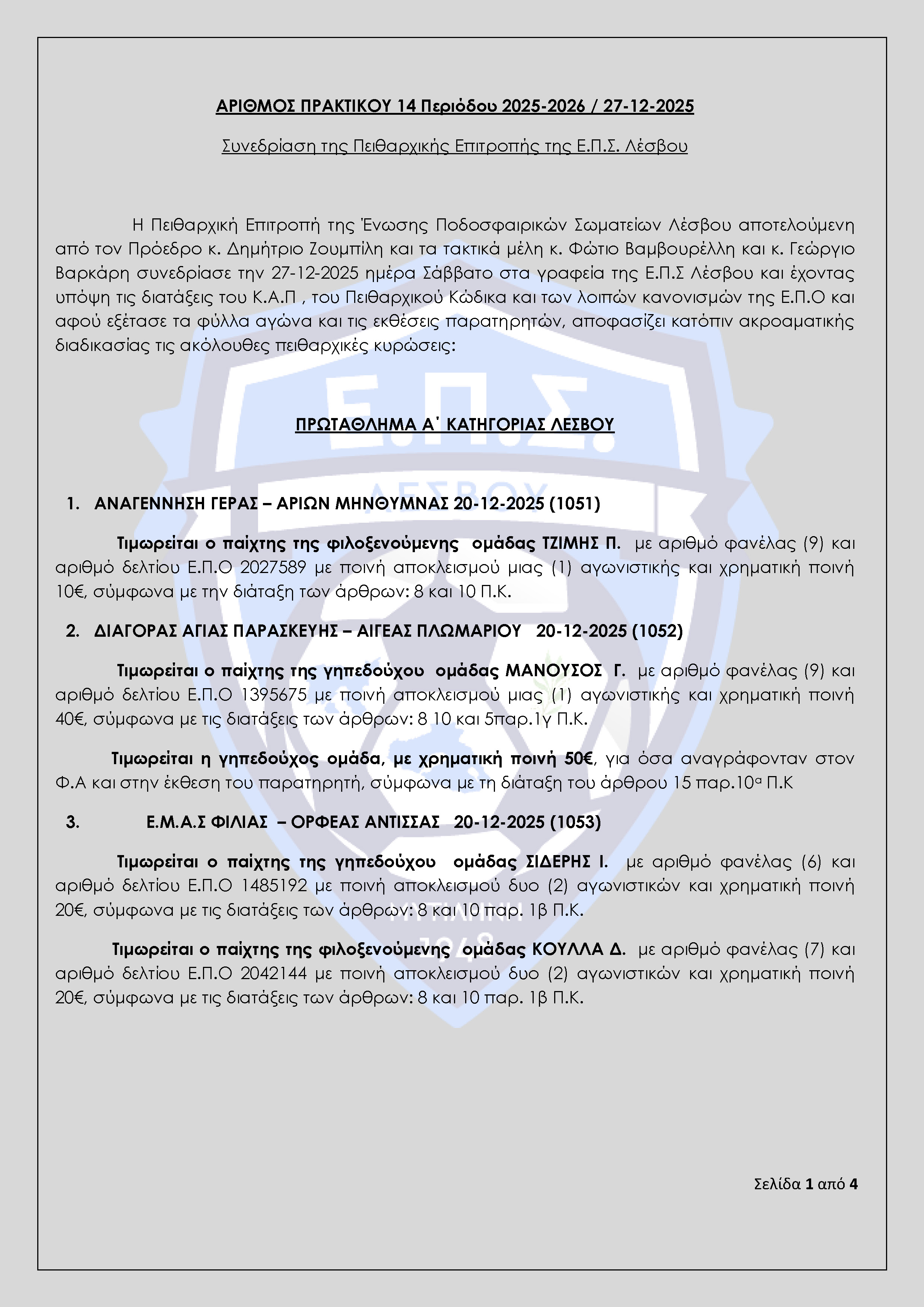 Απόφαση Πειθαρχικής Επιτροπής Ε.Π.Σ Λέσβου Αγωνιστικής Περιόδου 2025-2026 (Πρακτικό 14)