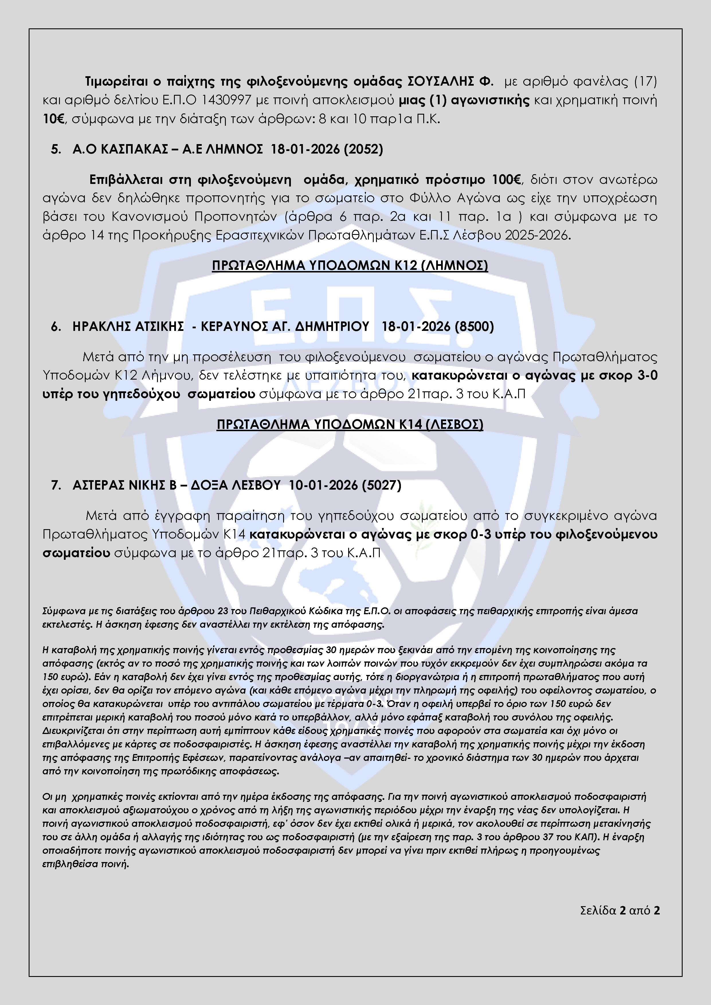 Απόφαση Πειθαρχικής Επιτροπής Ε.Π.Σ Λέσβου Αγωνιστικής Περιόδου 2025-2026 (Πρακτικό 16)