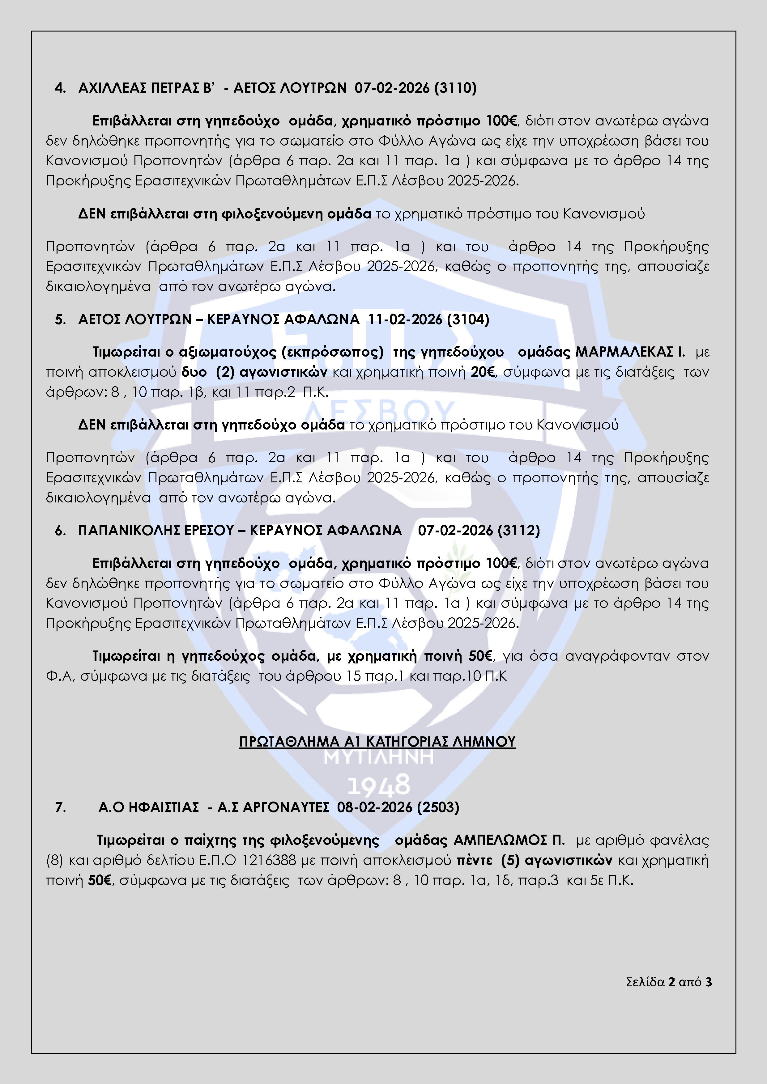 Απόφαση Πειθαρχικής Επιτροπής Ε.Π.Σ Λέσβου Αγωνιστικής Περιόδου 2025-2026 (Πρακτικό 19)