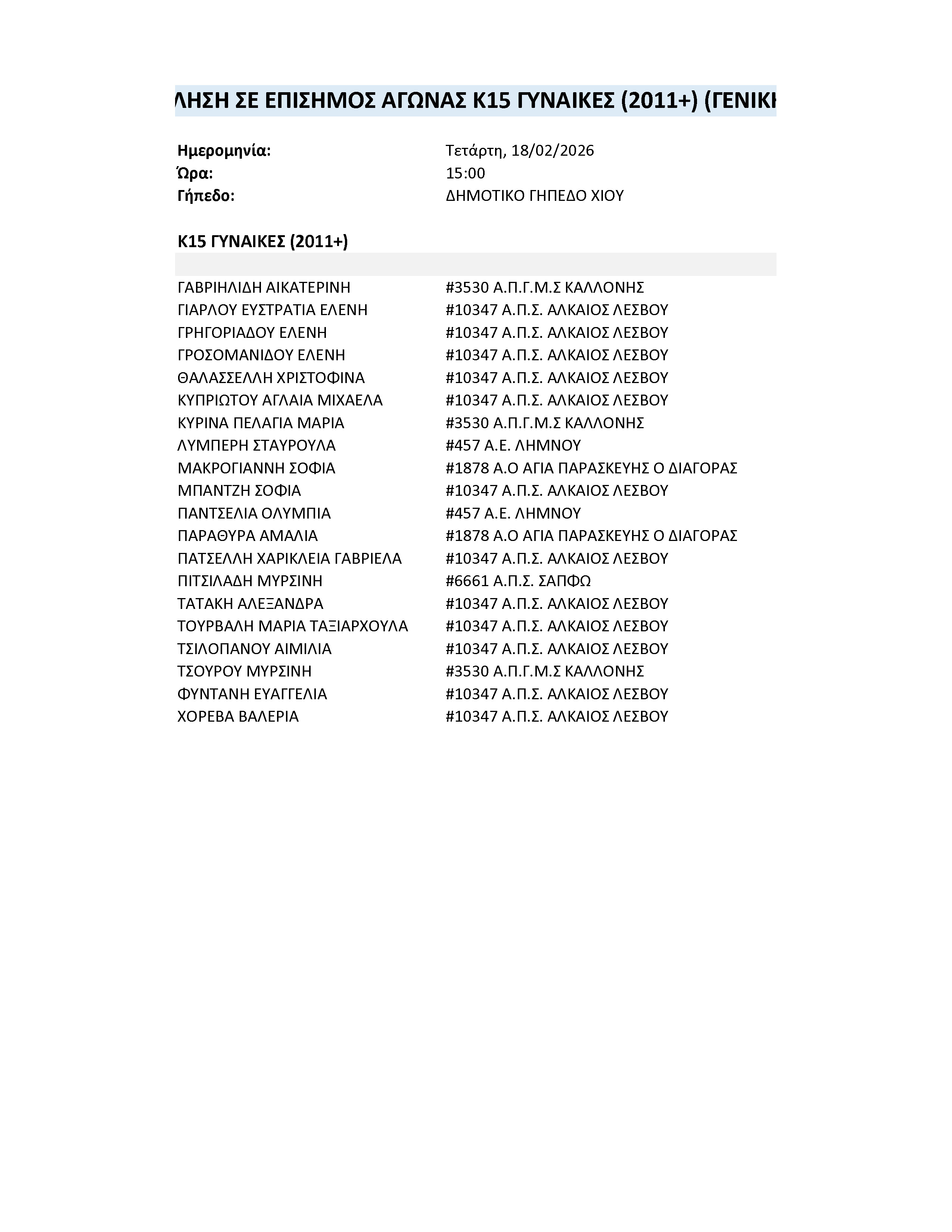 Kλήση σε αγώνα Μικτής Κ15 Γυναικών