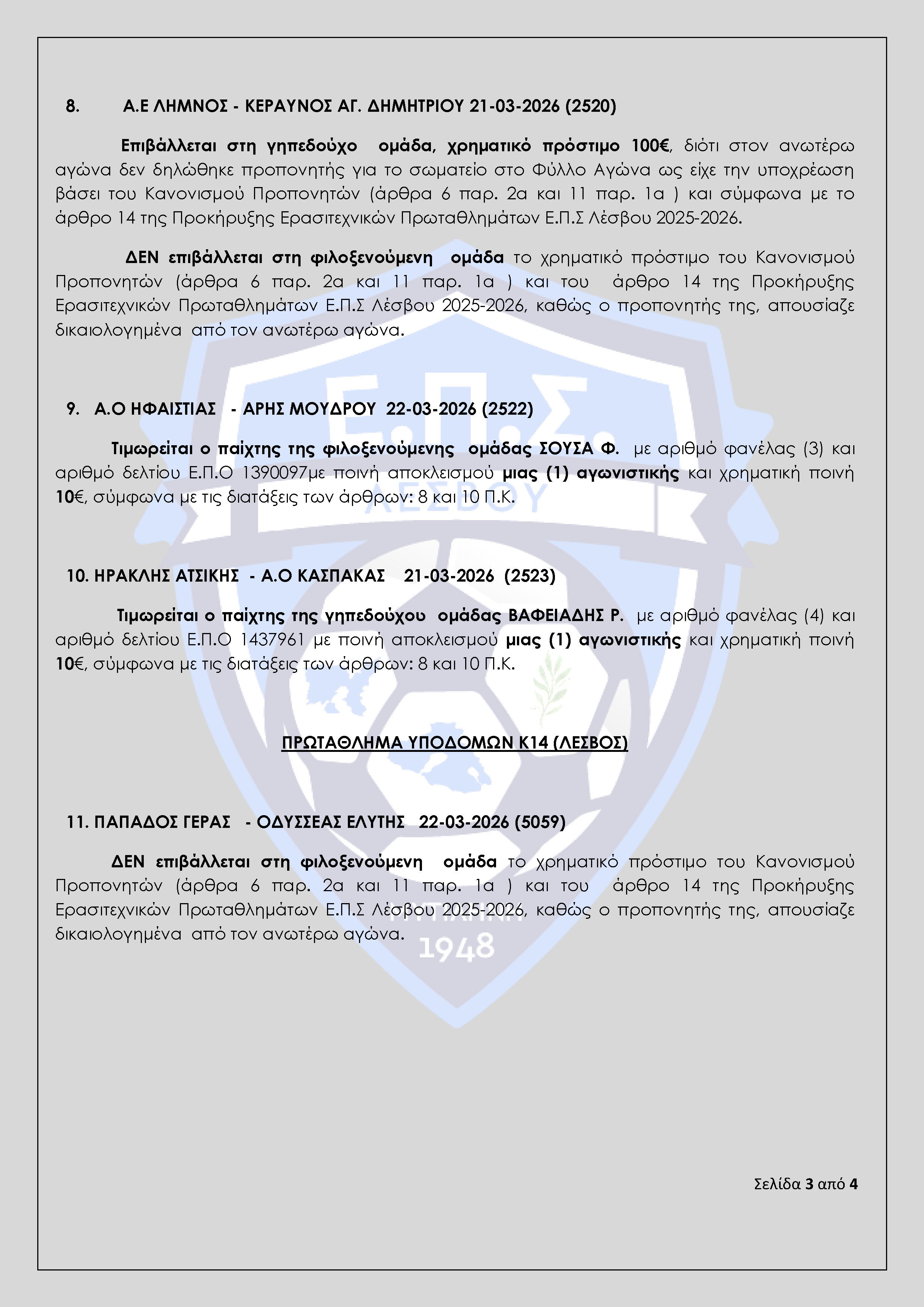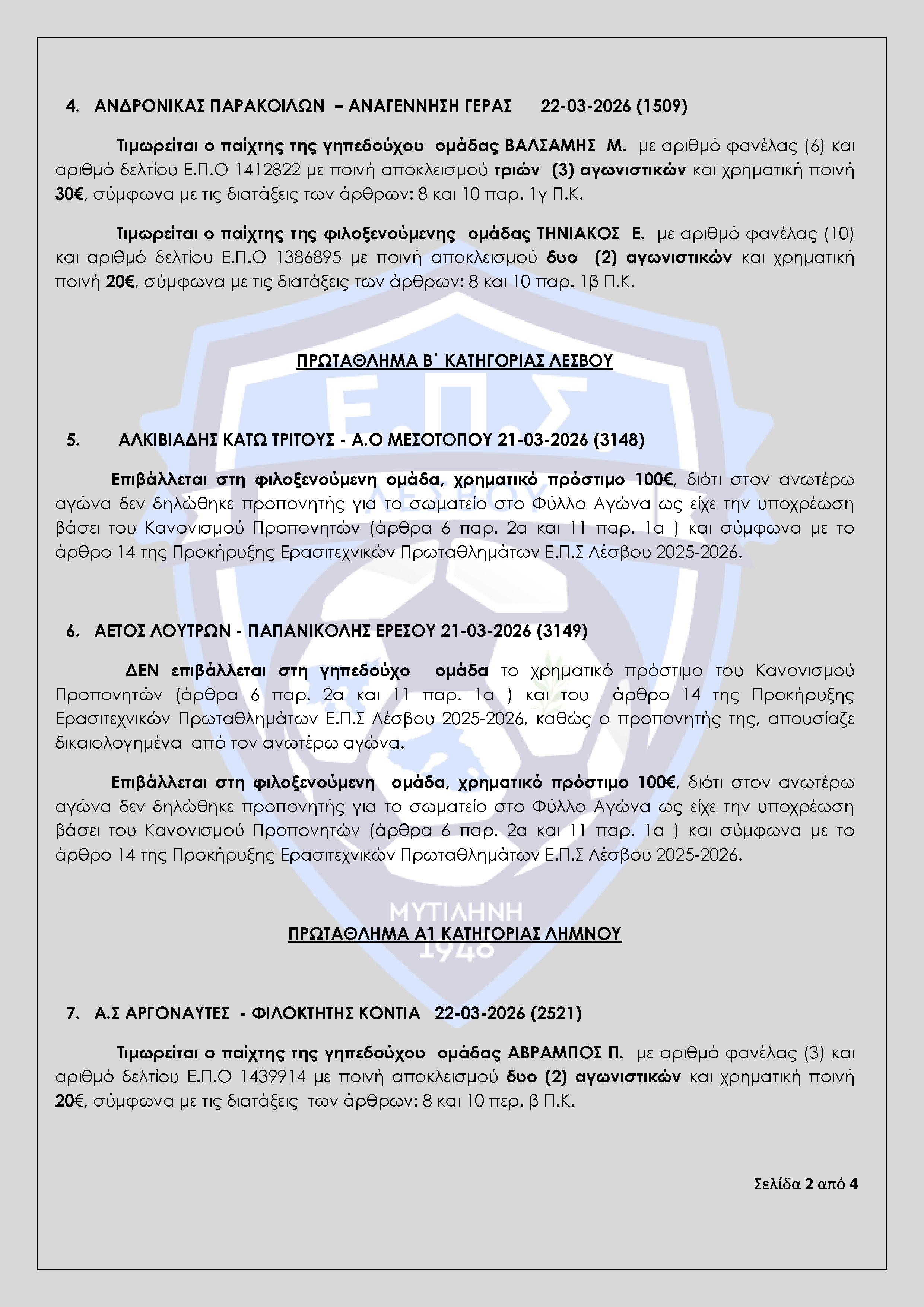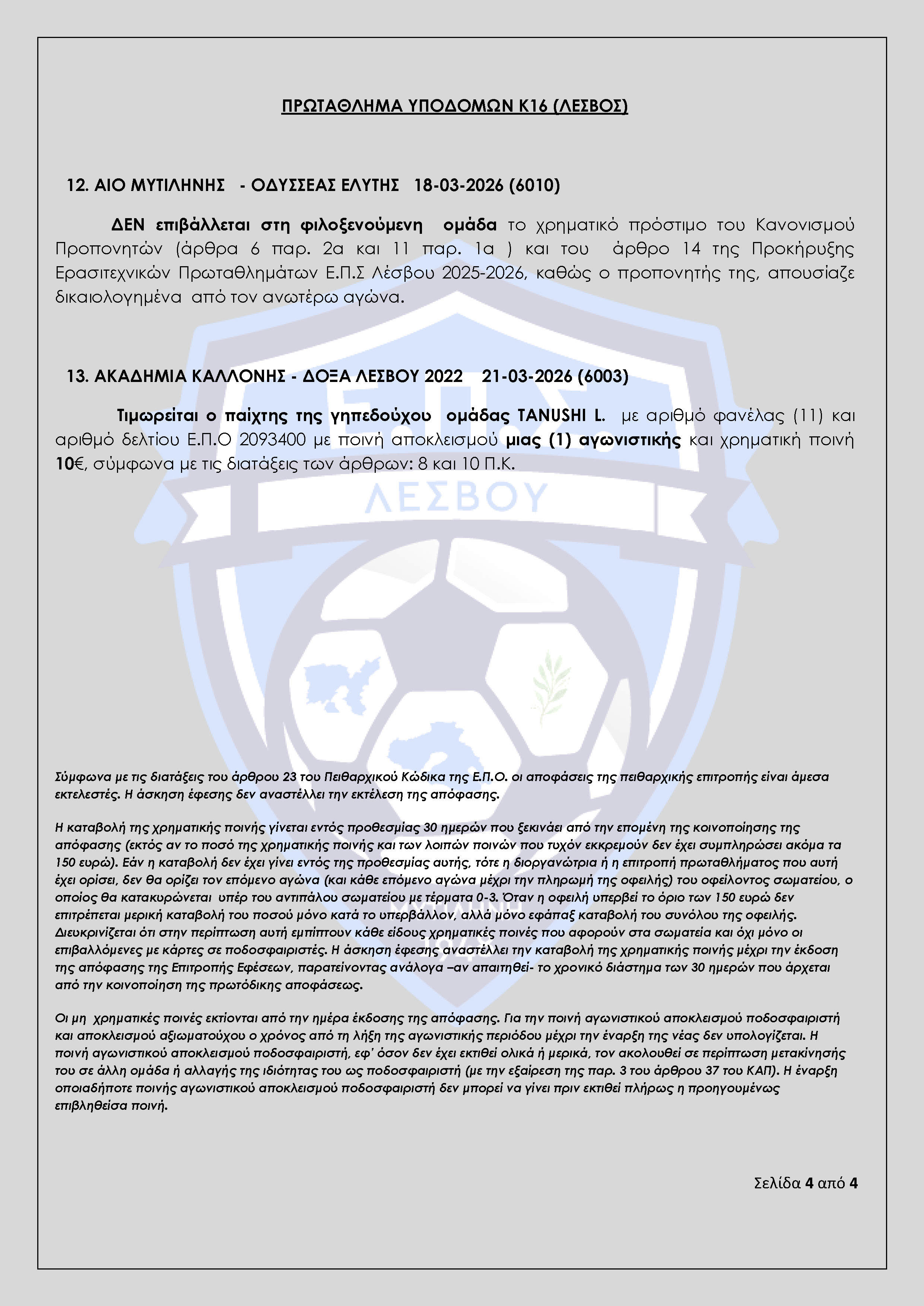 Απόφαση Πειθαρχικής Επιτροπής Ε.Π.Σ Λέσβου Αγωνιστικής Περιόδου 2025-2026 (Πρακτικό 25)
