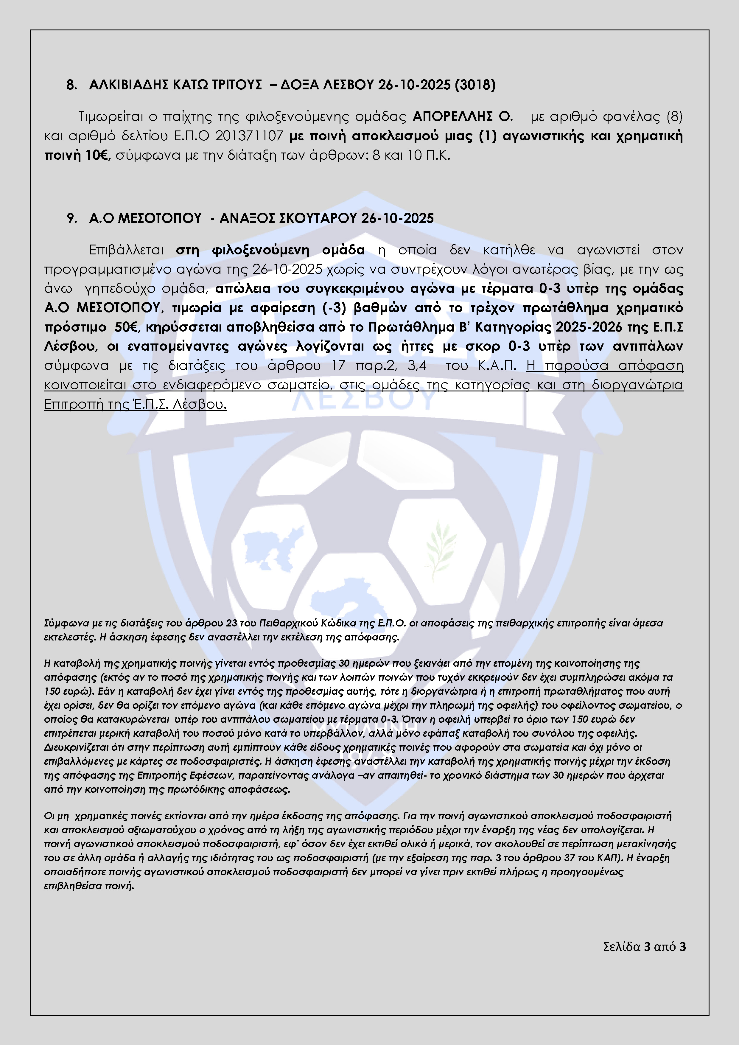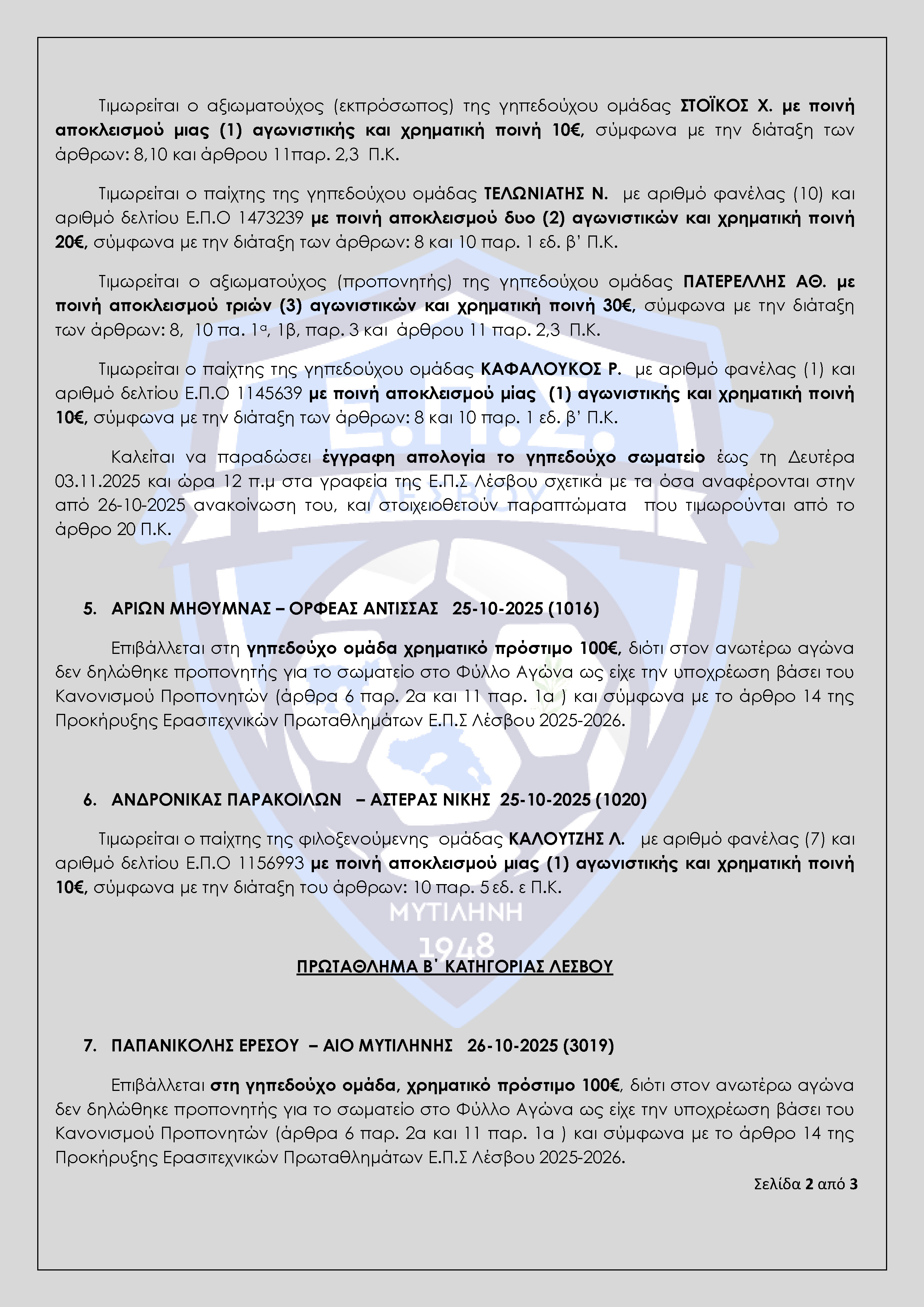 Απόφαση Πειθαρχικής Επιτροπής Ε.Π.Σ Λέσβου Αγωνιστικής Περιόδου 2025-2026 (Πρακτικό 6)