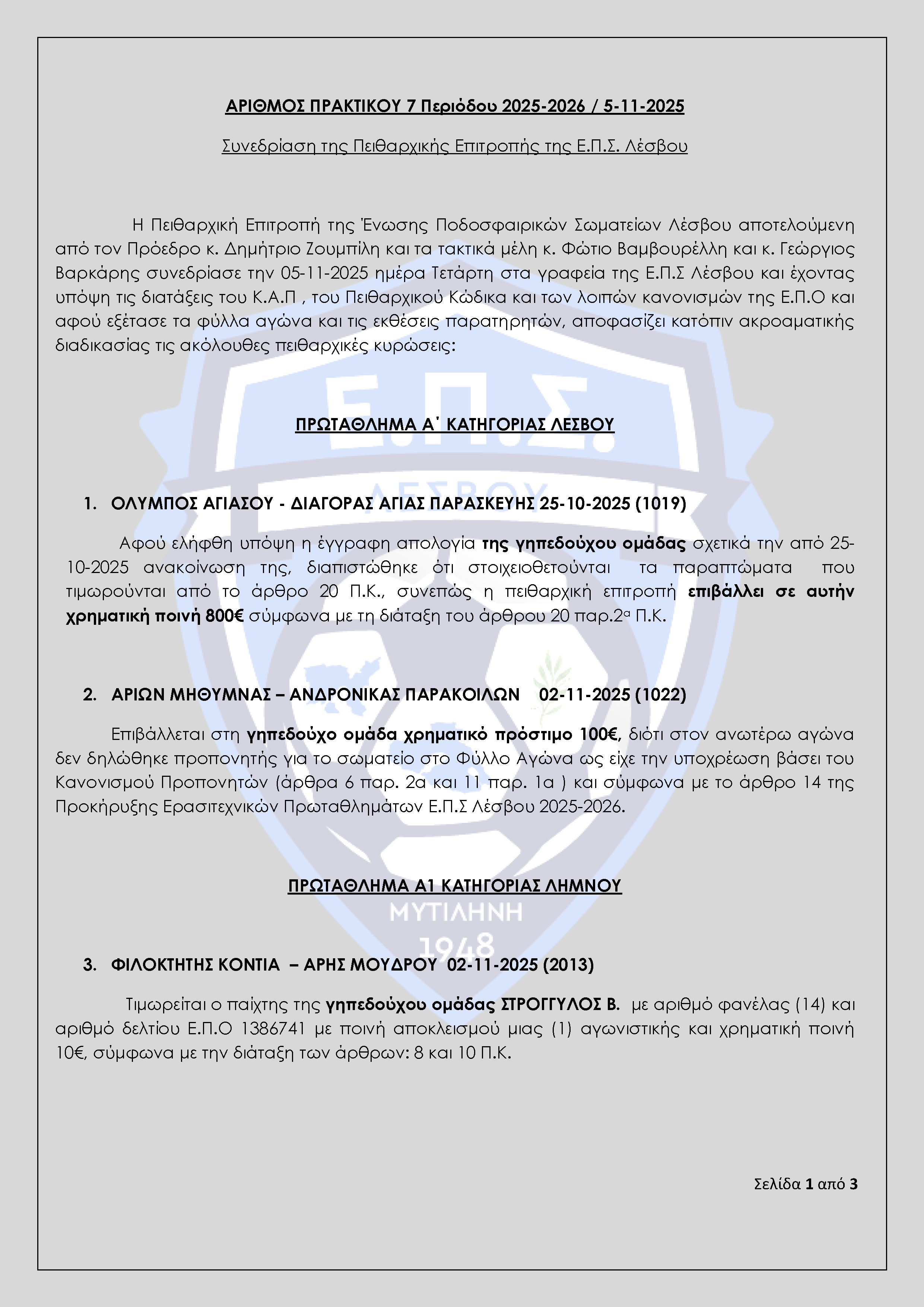 Απόφαση Πειθαρχικής Επιτροπής Ε.Π.Σ Λέσβου Αγωνιστικής Περιόδου 2025-2026 (Πρακτικό 7)