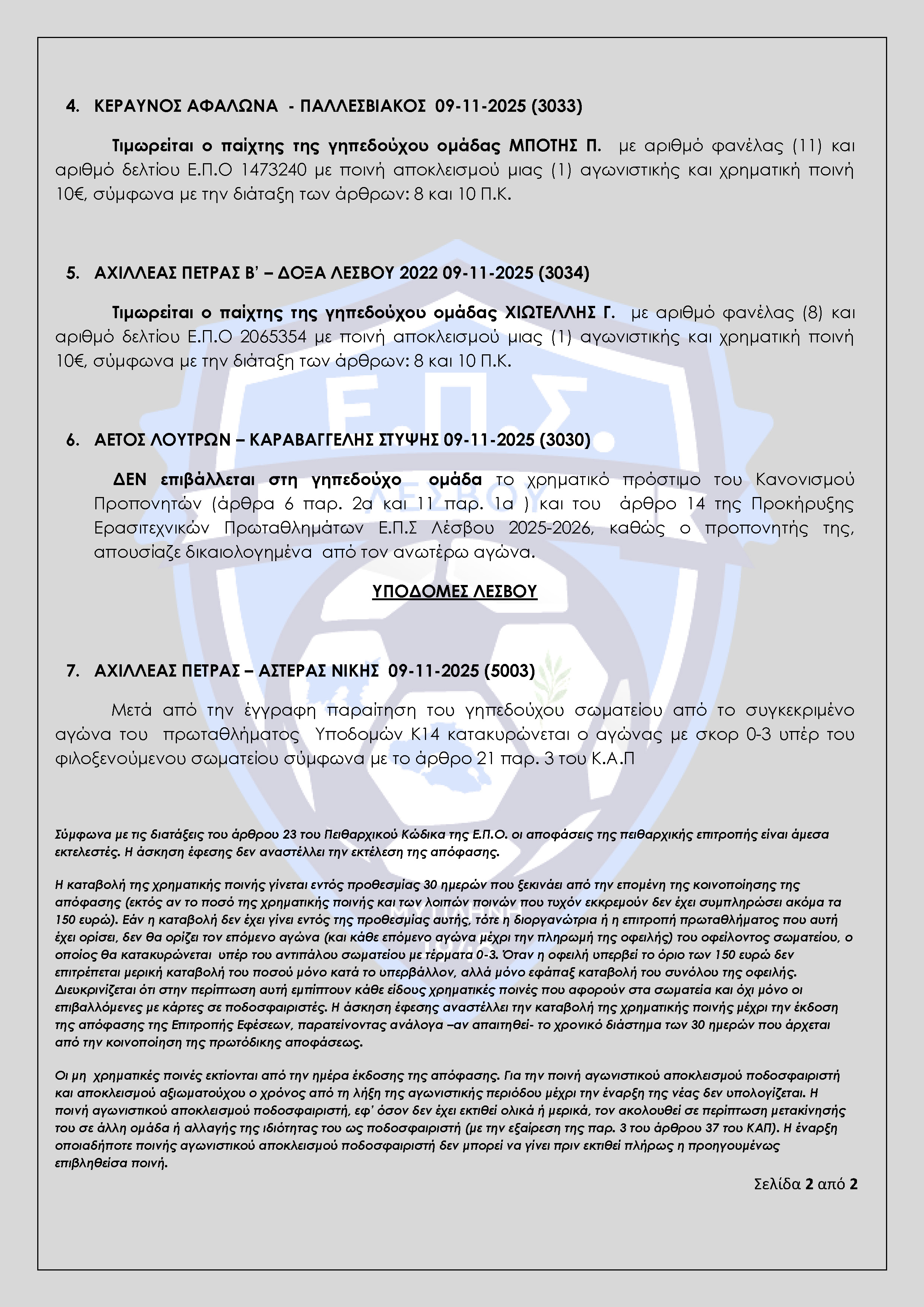 Απόφαση Πειθαρχικής Επιτροπής Ε.Π.Σ Λέσβου Αγωνιστικής Περιόδου 2025-2026 (Πρακτικό 8)