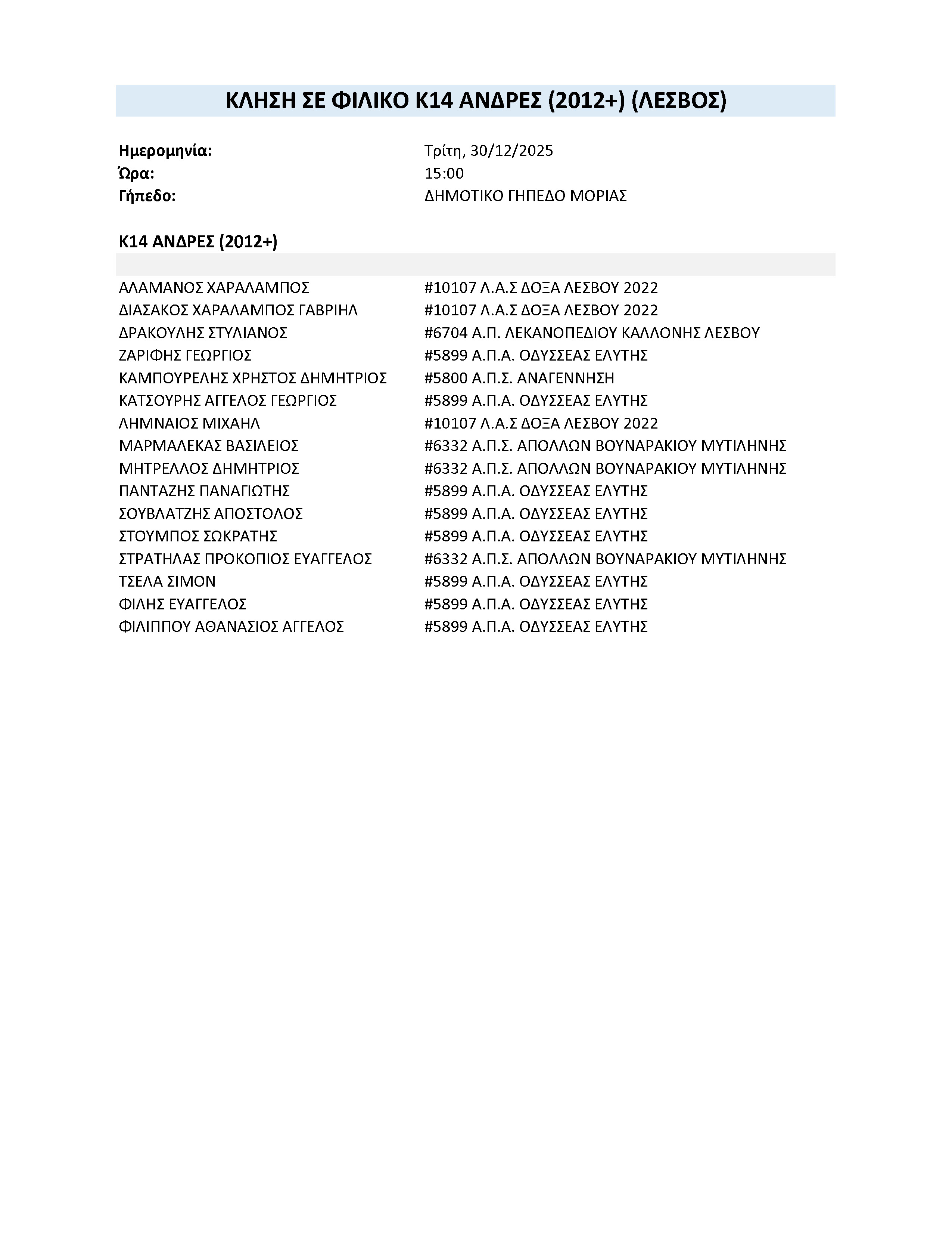 Η Ε.Π.Σ. Λέσβου καλεί τους παρακάτω ποδοσφαιριστές της ηλικιακής κατηγορίας Κ-14 (γεννηθέντες 2012–2013) σωματείων Λέσβου , σε προπόνηση -φιλικό που θα πραγματοποιηθεί :
