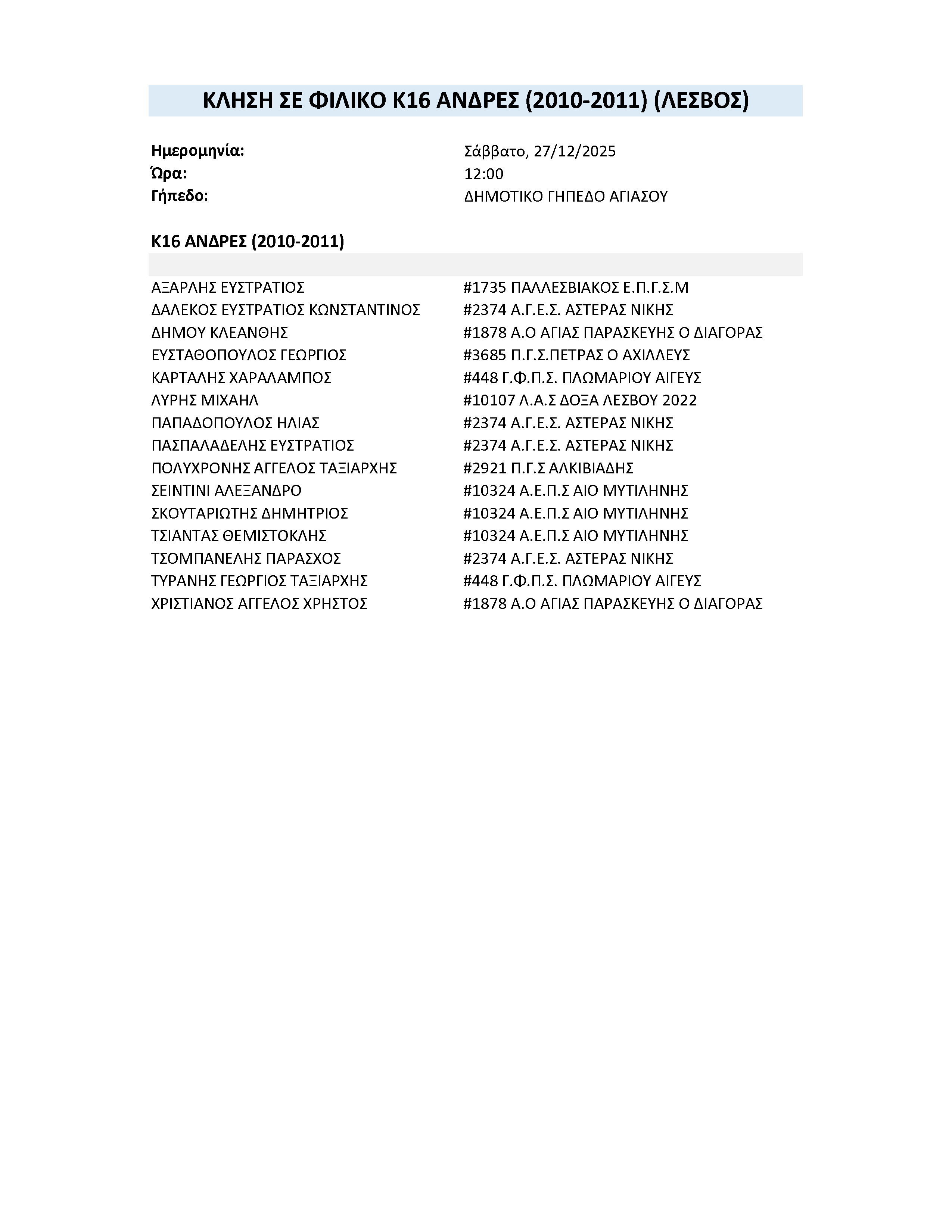 Η Ε.Π.Σ. Λέσβου καλεί τους παρακάτω ποδοσφαιριστές της ηλικιακής κατηγορίας Κ-16 (γεννηθέντες 2010–2011) σωματείων Λέσβου, σε φιλικό αγώνα - προπόνηση που θα πραγματοποιηθεί :