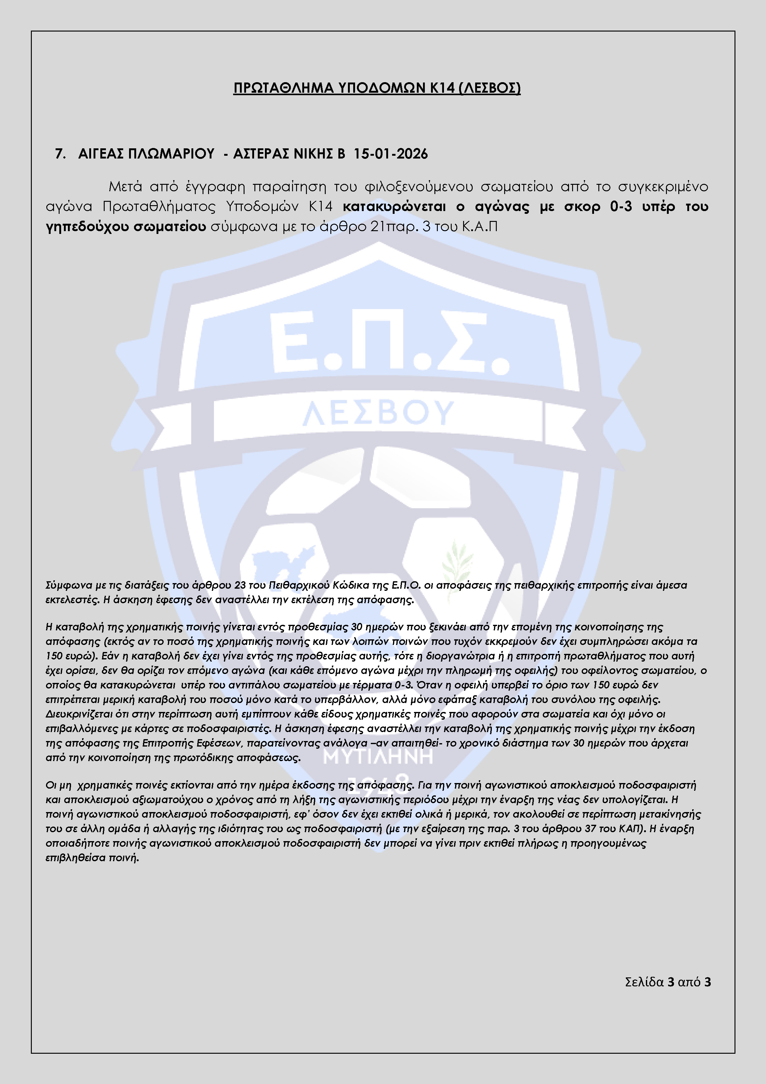Απόφαση Πειθαρχικής Επιτροπής Ε.Π.Σ Λέσβου Αγωνιστικής Περιόδου 2025-2026 (Πρακτικό 15)