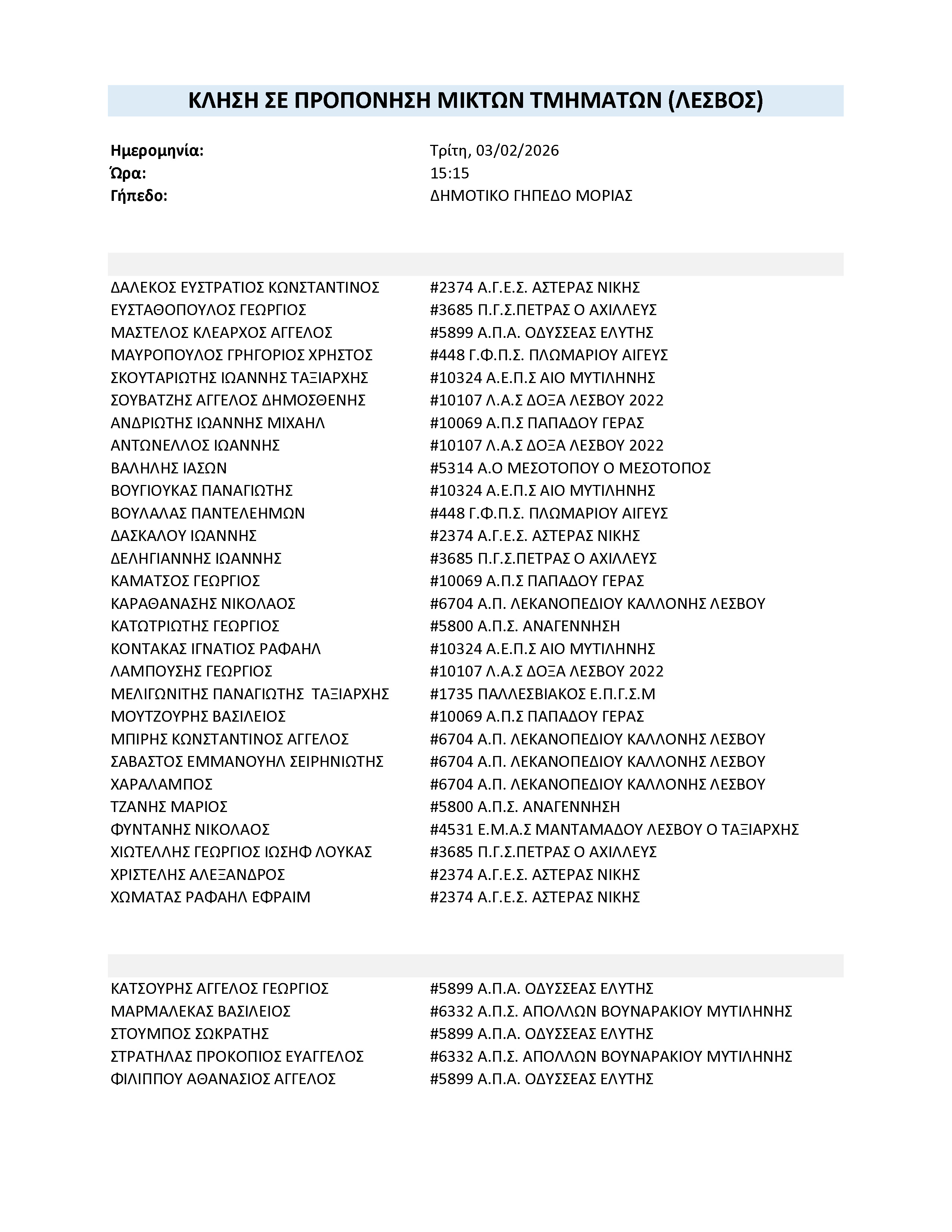 Η Ε.Π.Σ. Λέσβου καλεί τους παρακάτω ποδοσφαιριστές γεννηθέντες 2011–2012 σωματείων Λέσβου, σε προπόνηση -προεπιλογή για τη νέα περίοδο 2026-2027 που θα πραγματοποιηθεί :