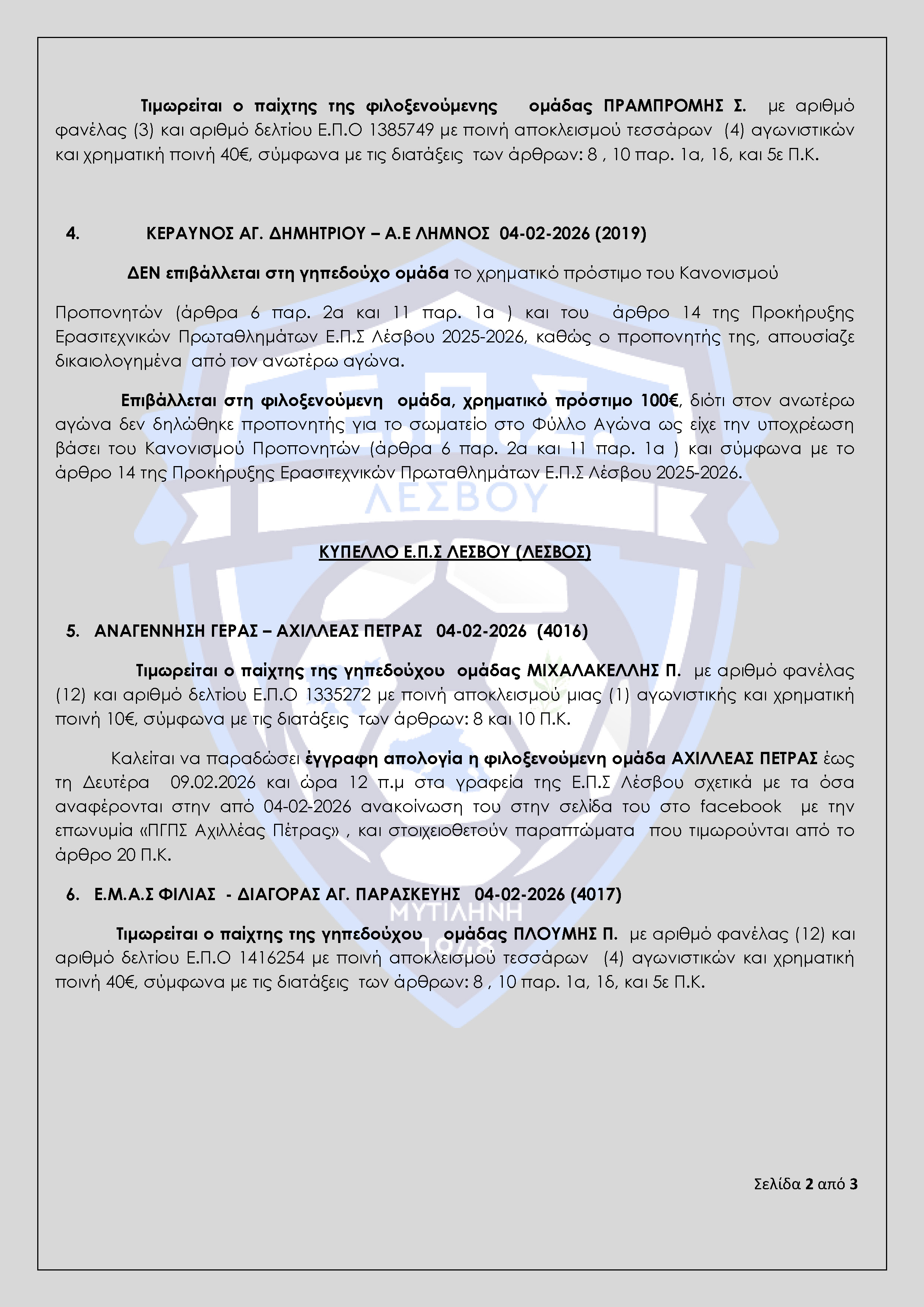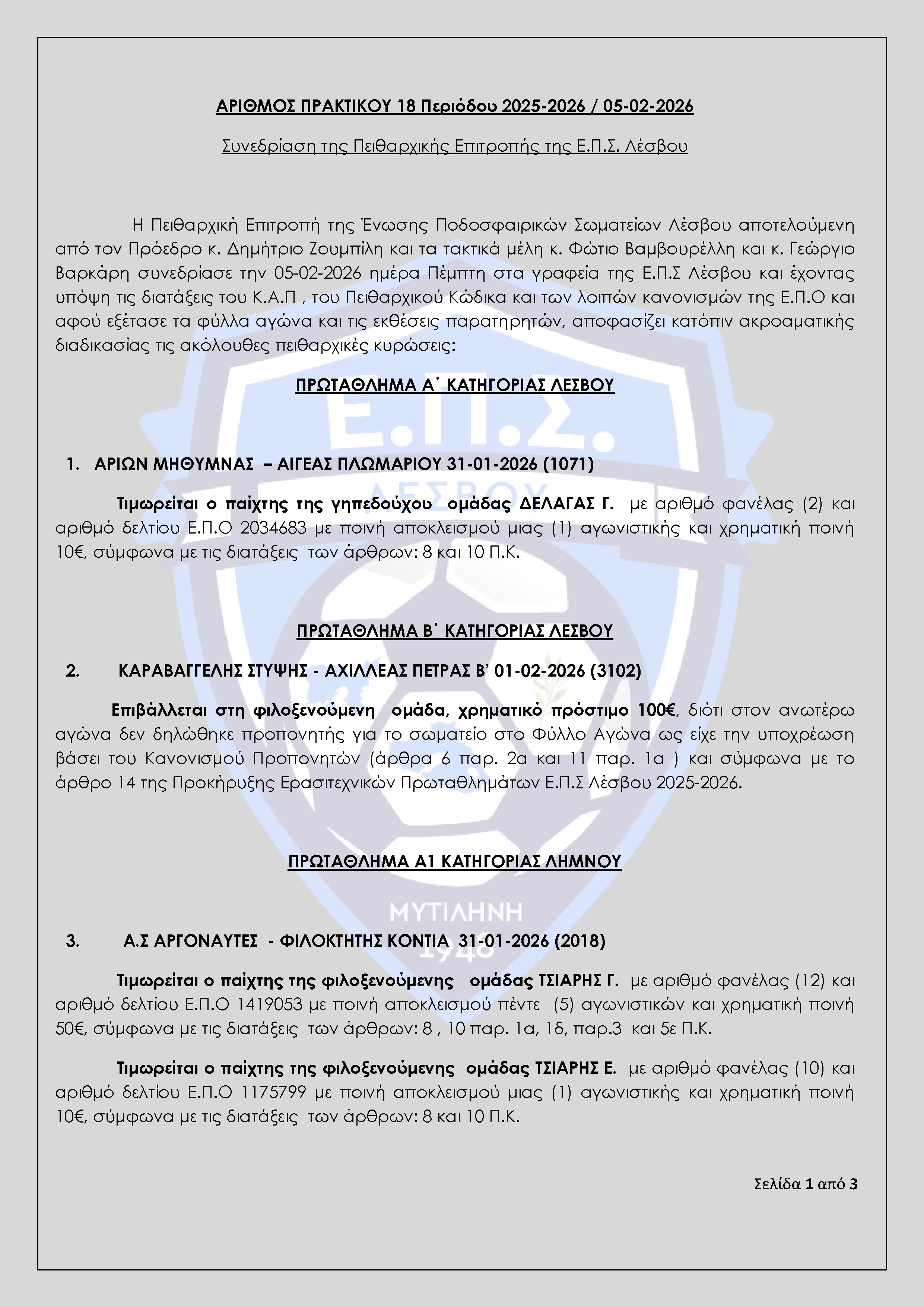 Απόφαση Πειθαρχικής Επιτροπής Ε.Π.Σ Λέσβου Αγωνιστικής Περιόδου 2025-2026 (Πρακτικό 18)