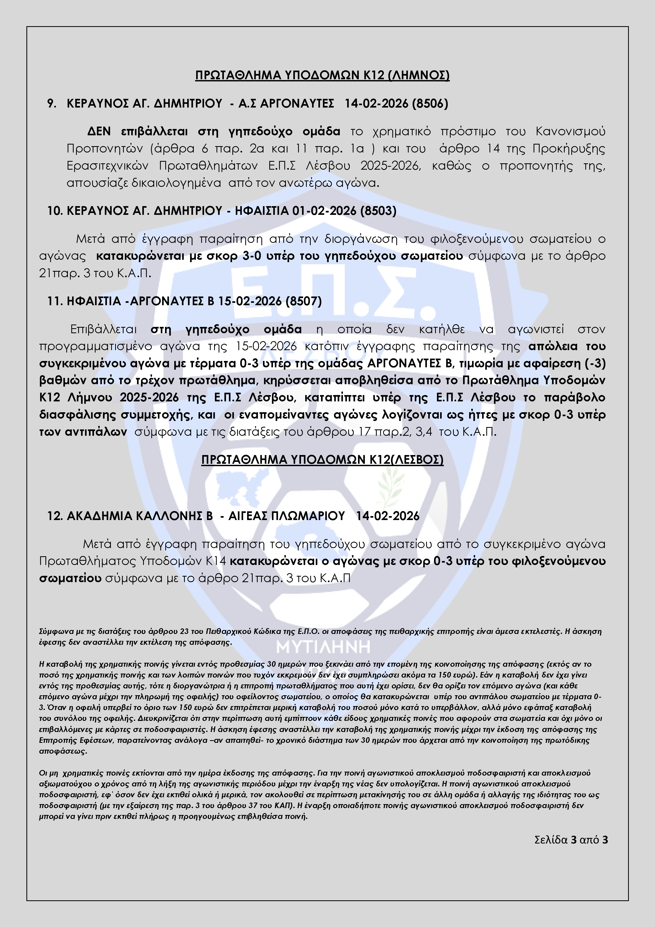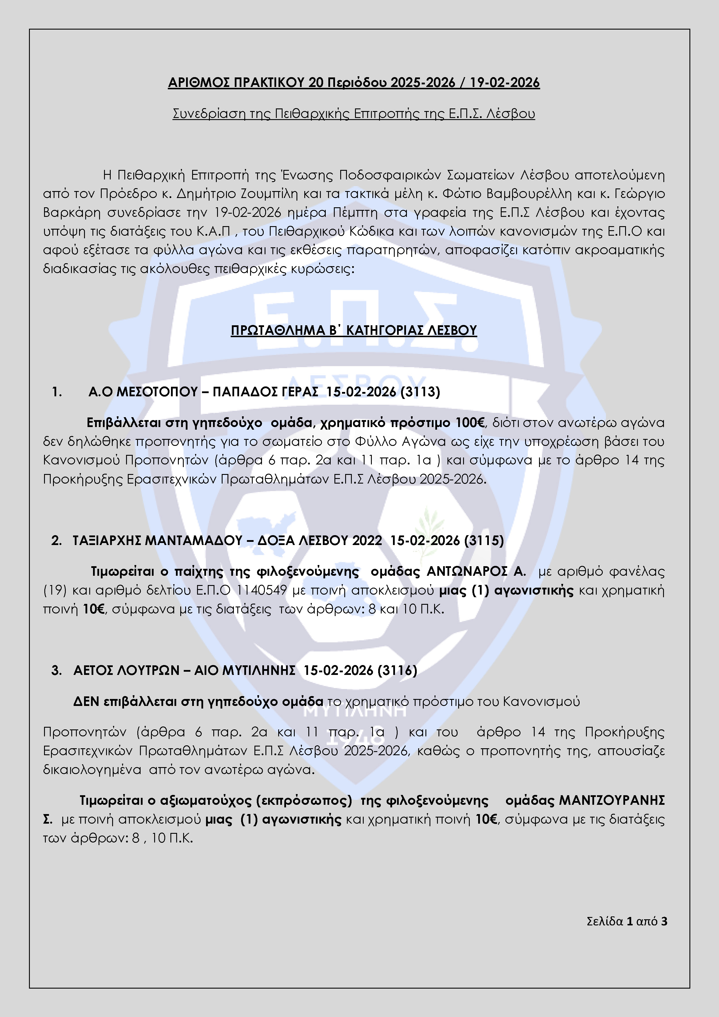 Απόφαση Πειθαρχικής Επιτροπής Ε.Π.Σ Λέσβου Αγωνιστικής Περιόδου 2025-2026 (Πρακτικό 20)