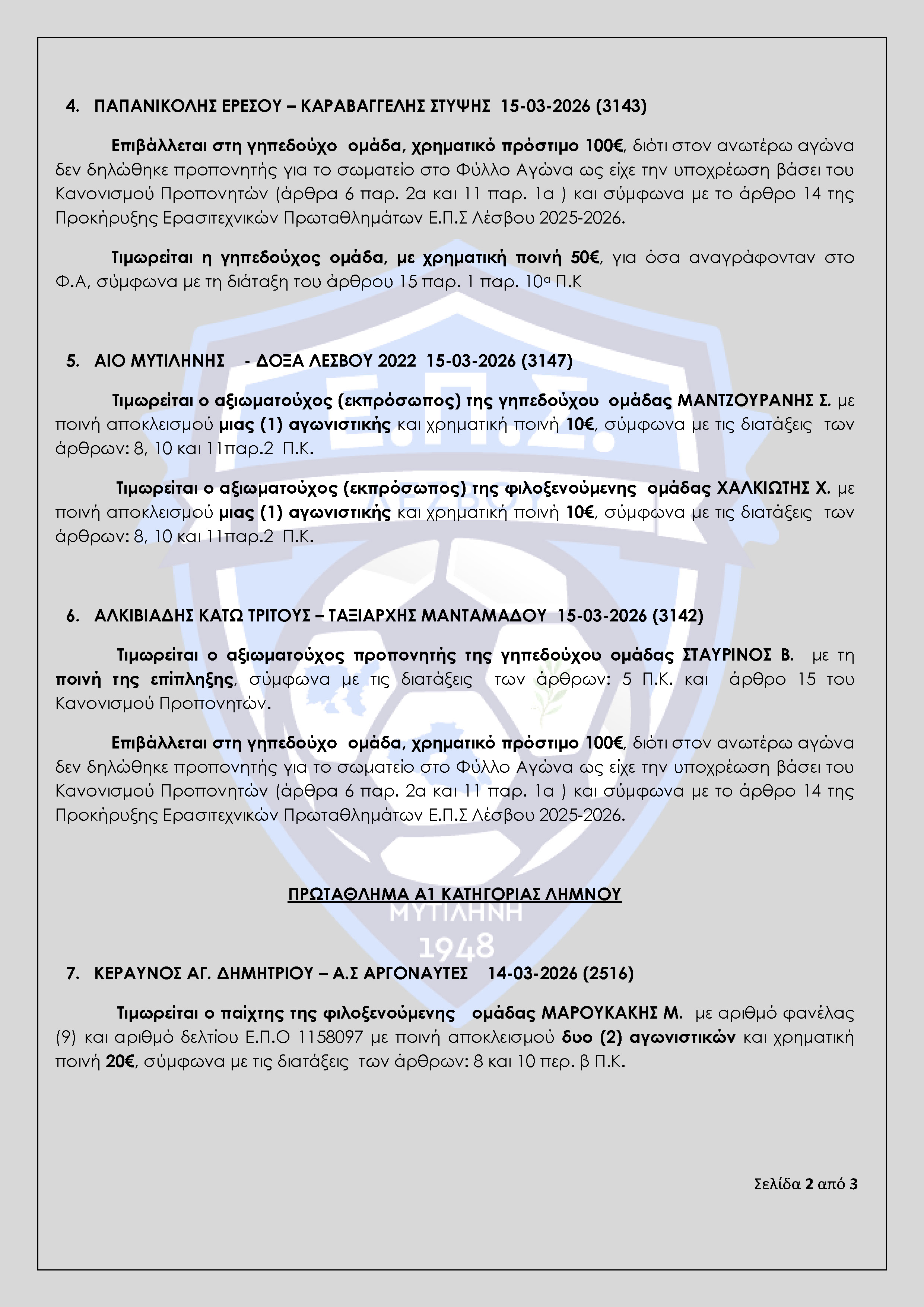 Απόφαση Πειθαρχικής Επιτροπής Ε.Π.Σ Λέσβου Αγωνιστικής Περιόδου 2025-2026 (Πρακτικό 24)