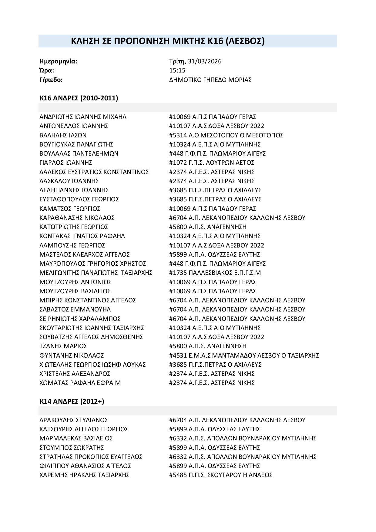 Η Ε.Π.Σ. Λέσβου καλεί τους παρακάτω ποδοσφαιριστές γεννηθέντες 2011–2012 σωματείων Λέσβου, σε προπόνηση -προεπιλογή για τη νέα περίοδο 2026-2027 που θα πραγματοποιηθεί :